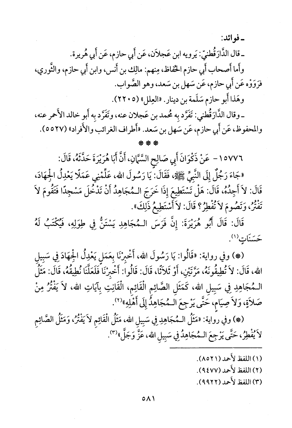 - وفي رواية: «مثل المجاهد في سبيل الله، مثل القائم لا يفتر، ومثل الصائم لا يفطر، حتى يرجع المجاهد في سبيل الله، عز وجل» (¬٣).