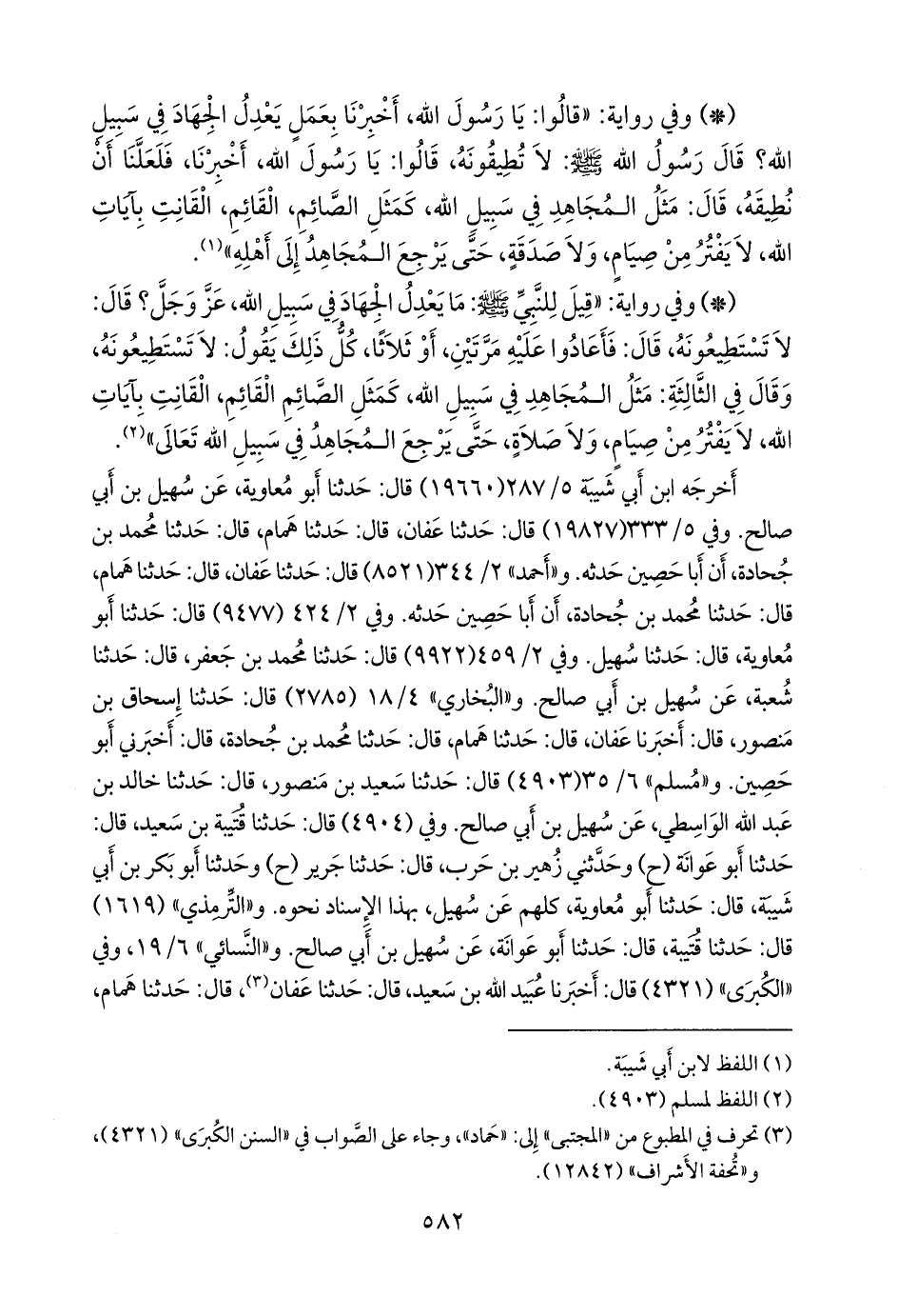 - وفي رواية: «قيل للنبي صَلى الله عَليه وسَلم: ما يعدل الجهاد في سبيل الله، عز وجل؟ قال: لا تستطيعونه، قال: فأعادوا عليه مرتين، أو ثلاثا، كل ذلك يقول: لا تستطيعونه، وقال في الثالثة: مثل المجاهد في سبيل الله، كمثل الصائم القائم، القانت بآيات الله، لا يفتر من صيام، ولا صلاة، حتى يرجع المجاهد في سبيل الله تعالى» (¬١).