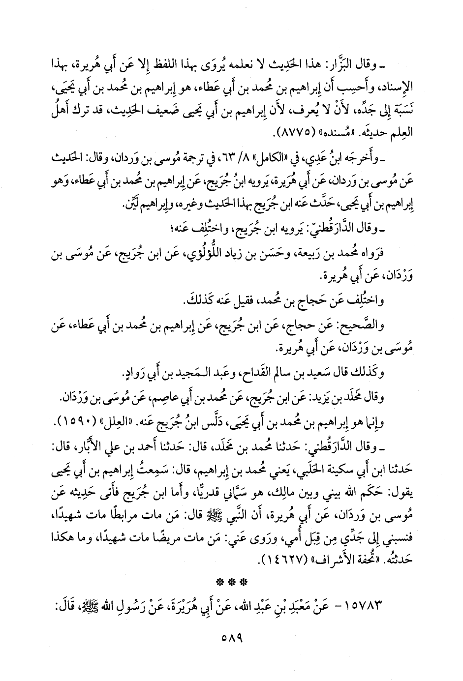 وقال ٩/ ٥٤٦: الحديث عن موسى بن وَردان، عن أَبي هريرة، يرويه ابن جُريج، عن إِبراهيم بن محمد بن أَبي عطاء، وهو إِبراهيم بن أَبي يَحيى، حَدث عنه ابن جُريج بهذا الحديث وغيره، وإِبراهيم لين.