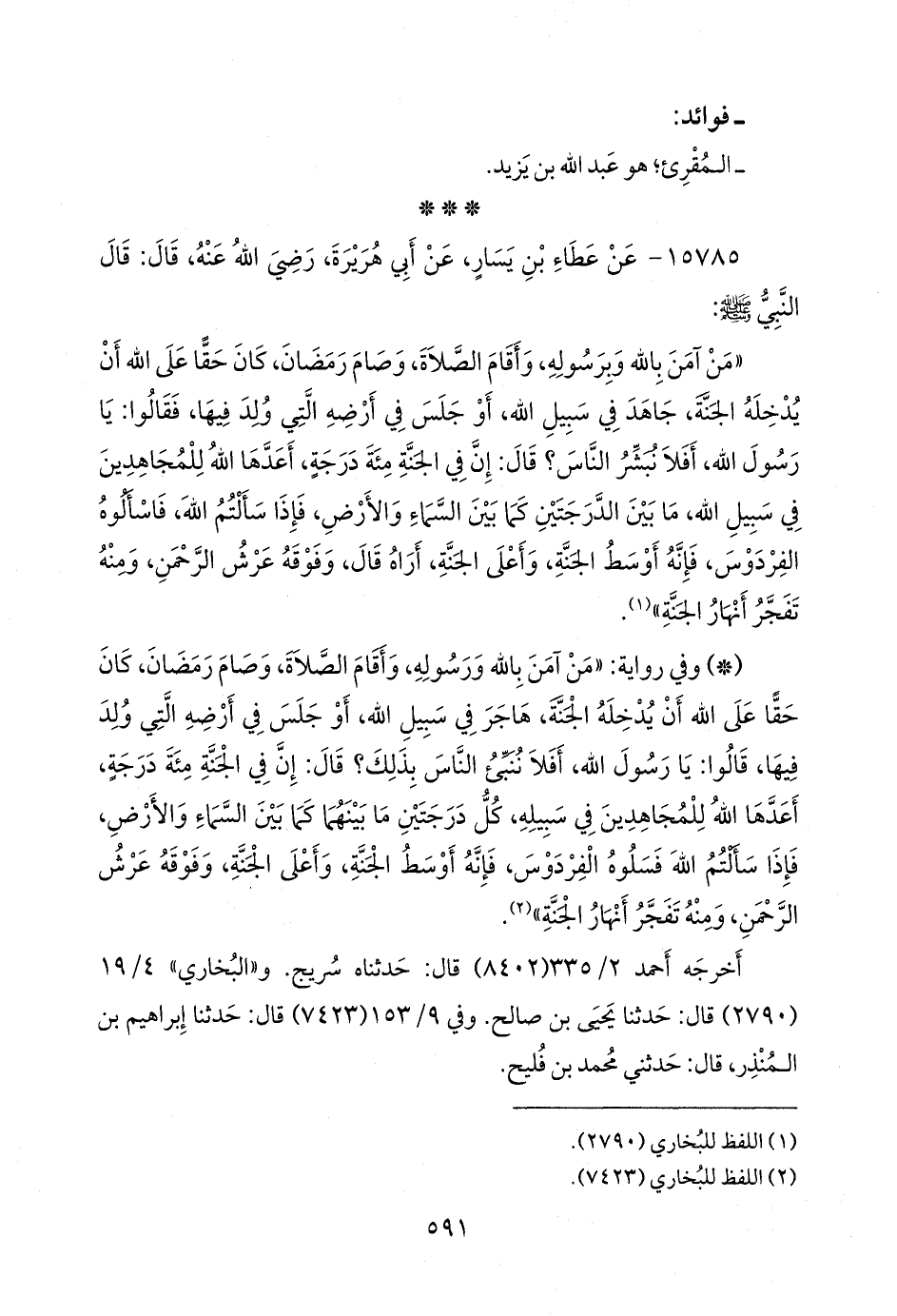 - وفي رواية: «من آمن بالله ورسوله، وأقام الصلاة، وصام رمضان، كان حقا على الله أن يدخله الجنة، هاجر في سبيل الله، أو جلس في أرضه التي ولد فيها، قالوا: يا رسول الله، أفلا ننبئ الناس بذلك؟ قال: إن في الجنة مئة درجة، أعدها الله للمجاهدين في سبيله، كل درجتين ما بينهما كما بين السماء والأرض، فإذا سألتم الله فسلوه الفردوس، فإنه أوسط الجنة، وأعلى الجنة، وفوقه عرش الرَّحمَن، ومنه تفجر أنهار الجنة» (¬٢).