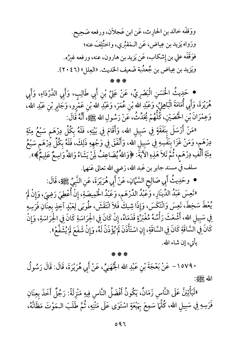 «تعس عبد الدينار، وعبد الدرهم، وعبد الخميصة، إن أعطي رضي، وإن لم يعط سخط، تعس وانتكس، وإذا شيك فلا انتقش، طوبى لعبد آخذ بعنان فرسه في سبيل الله، أشعث رأسه مغبرة قدماه، إن كان في الحراسة كان في الحراسة، وإن كان في الساقة كان في الساقة، إن استاذن لم يؤذن له، وإن شفع لم يشفع».
