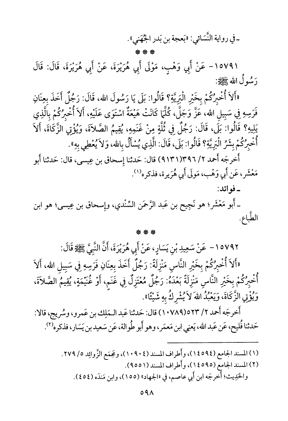 «ألا أخبركم بخير الناس منزلة: رجل أخذ بعنان فرسه في سبيل الله، ألا أخبركم بخير الناس منزلة بعده: رجل معتزل في غنم، أو غنيمة، يقيم الصلاة، ويؤتي الزكاة، ويعبد الله لا يشرك به شيئا».