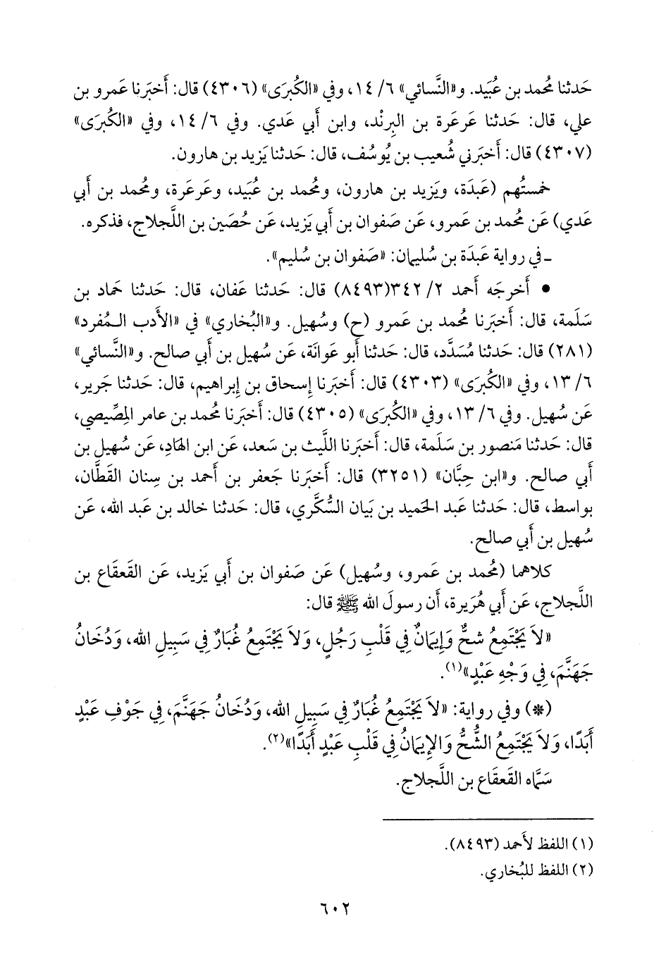 - وفي رواية: «لا يجتمع غبار في سبيل الله، ودخان جهنم، في جوف عبد أبدا، ولا يجتمع الشح والإيمان في قلب عبد أبدا» (¬٢).