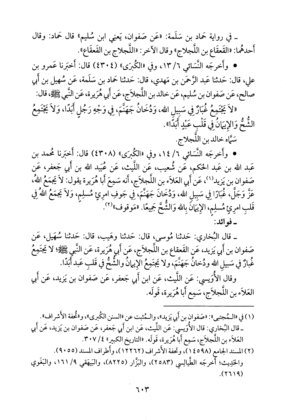 • وأخرجه النَّسَائي ٦/ ١٤، وفي «الكبرى» (٤٣٠٨) قال: أخبرنا محمد بن عبد الله بن عبد الحكم، عن شعيب، عن الليث، عن عُبيد الله بن أبي جعفر، عن صفوان بن يزيد (¬١)، عن أبي العلاء بن اللجلاج، أنه سمع أبا هريرة يقول: لا يجمع الله، عز وجل، غبارا في سبيل الله، ودخان جهنم، في جوف امرئ مسلم، ولا يجمع الله في قلب امرئ مسلم، الإيمان بالله والشح جميعا. «موقوف» (¬٢).