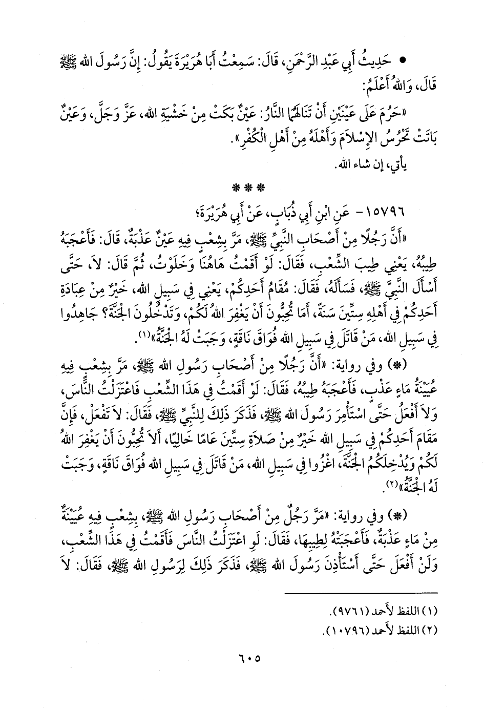 - وفي رواية: «أن رجلا من أصحاب رسول الله صَلى الله عَليه وسَلم مر بشعب فيه عُيينة ماء عذب، فأعجبه طيبه، فقال: لو أقمت في هذا الشعب فاعتزلت الناس، ولا أفعل حتى استامر رسول الله صَلى الله عَليه وسَلم فذكر ذلك للنبي صَلى الله عَليه وسَلم فقال: لا تفعل، فإن مقام أحدكم في سبيل الله خير من صلاة ستين عاما خاليا، ألا تحبون أن يغفر الله لكم ويدخلكم الجنة، اغزوا في سبيل الله، من قاتل في سبيل الله فواق ناقة، وجبت له الجنة» (¬٢).