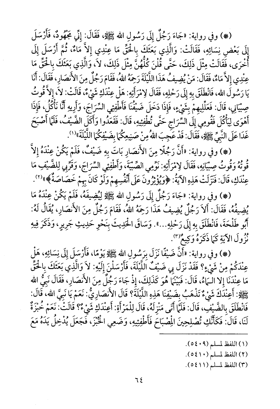 - وفي رواية: «أن ضيفا نزل برسول الله صَلى الله عَليه وسَلم يوما، فأرسل إلى نسائه، هل عندكم من شيء؟ فقد نزل بي ضيف الليلة، فأرسلن إليه: لا والذي بعثك بالحق ما عندنا إلا الماء، قال: فبينما هو كذلك، إذ جاء رجل من الأنصار، فقال نبي الله صَلى الله عَليه وسَلم: أعندك شيء تذهب بضيفنا هذه الليلة؟ قال الأَنصاري: نعم يا نبي الله، قال: فانطلق بالضيف، قال: فلما أتى منزله، قال للمرأة: أعندك شيء؟ قالت: نعم خُبزَة لنا، قال: فكأنك تصلحين المصباح فأطفئيه، وضعي الخبز، فجعل يدخل يده مع