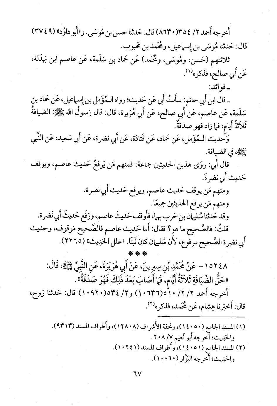 - قال عبد الرَّحمَن بن أبي حاتم الرازي: سألتُ أبي عن حديثٍ؛ رواه المُؤَمَّل بن إسماعيل، عن حماد بن سلمة، عن عاصم، عن أبي صالح، عن أبي هريرة، قال: قال رسول الله صَلى الله عَليه وسَلم: الضيافة ثلاثة أيام، فما زاد فهو صدقة.
