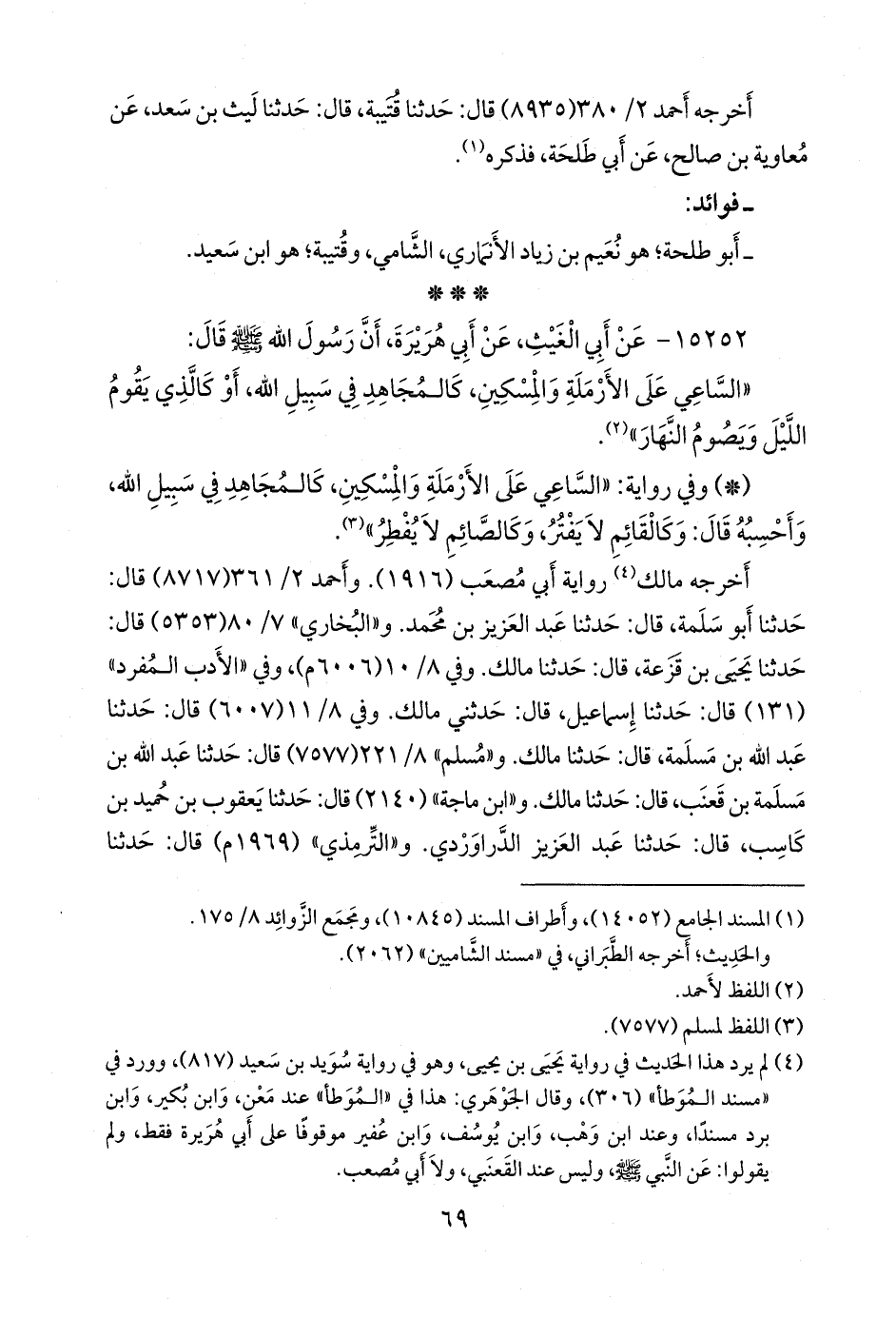 - وفي رواية: «الساعي على الأرملة والمسكين، كالمجاهد في سبيل الله، وأحسبه قال: وكالقائم لا يفتر، وكالصائم لا يفطر» (¬٢).