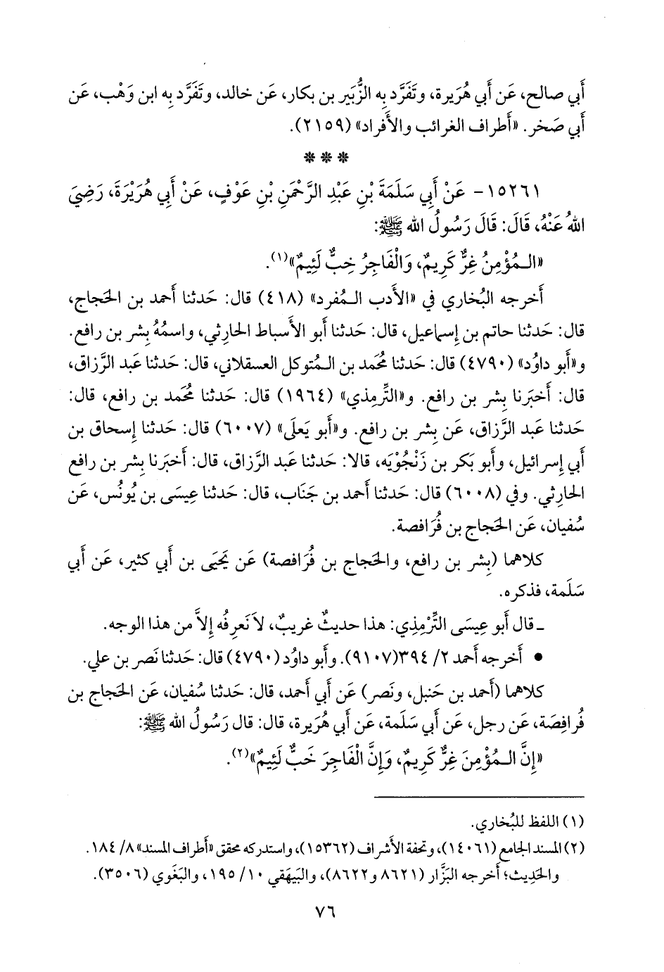 (¬٢) المسند الجامع (١٤٠٦١)، وتحفة الأشراف (١٥٣٦٢)، واستدركه محقق «أطراف المسند» ٨/ ١٨٤.