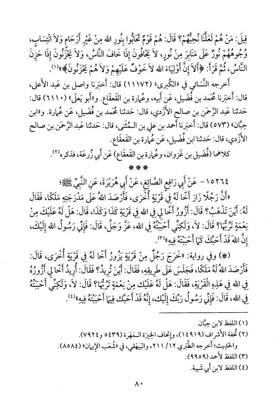 «أن رجلا زار أخا له في قرية أخرى، فأرصد الله على مدرجته ملكا، فقال له: أين تذهب؟ قال: أزور أخا لي في الله في قرية كذا وكذا، قال: هل له عليك من نعمة تربها؟ قال: لا، ولكني أحببته في الله، عز وجل، قال: فإني رسول الله إليك، إن الله قد أحبك كما أحببته فيه» (¬١).