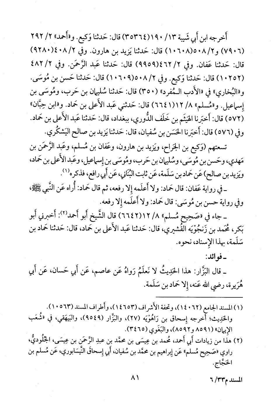 - في رواية عفان: قال حماد: ولا أعلمه إلا رفعه، ثم قال حماد: أراه عن النبي صَلى الله عَليه وسَلم وفي رواية حسن بن موسى: قال حماد: ولا أعلمه إلا رفعه.