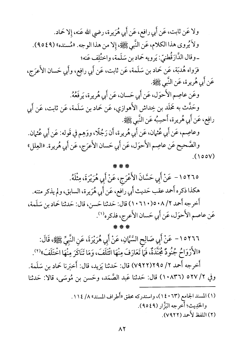 فرواه هُدبة، عن حماد بن سلمة، عن ثابت، عن أبي رافع، وأبي حسان الأعرج، عن أبي هريرة، عن النبي صَلى الله عَليه وسَلم.