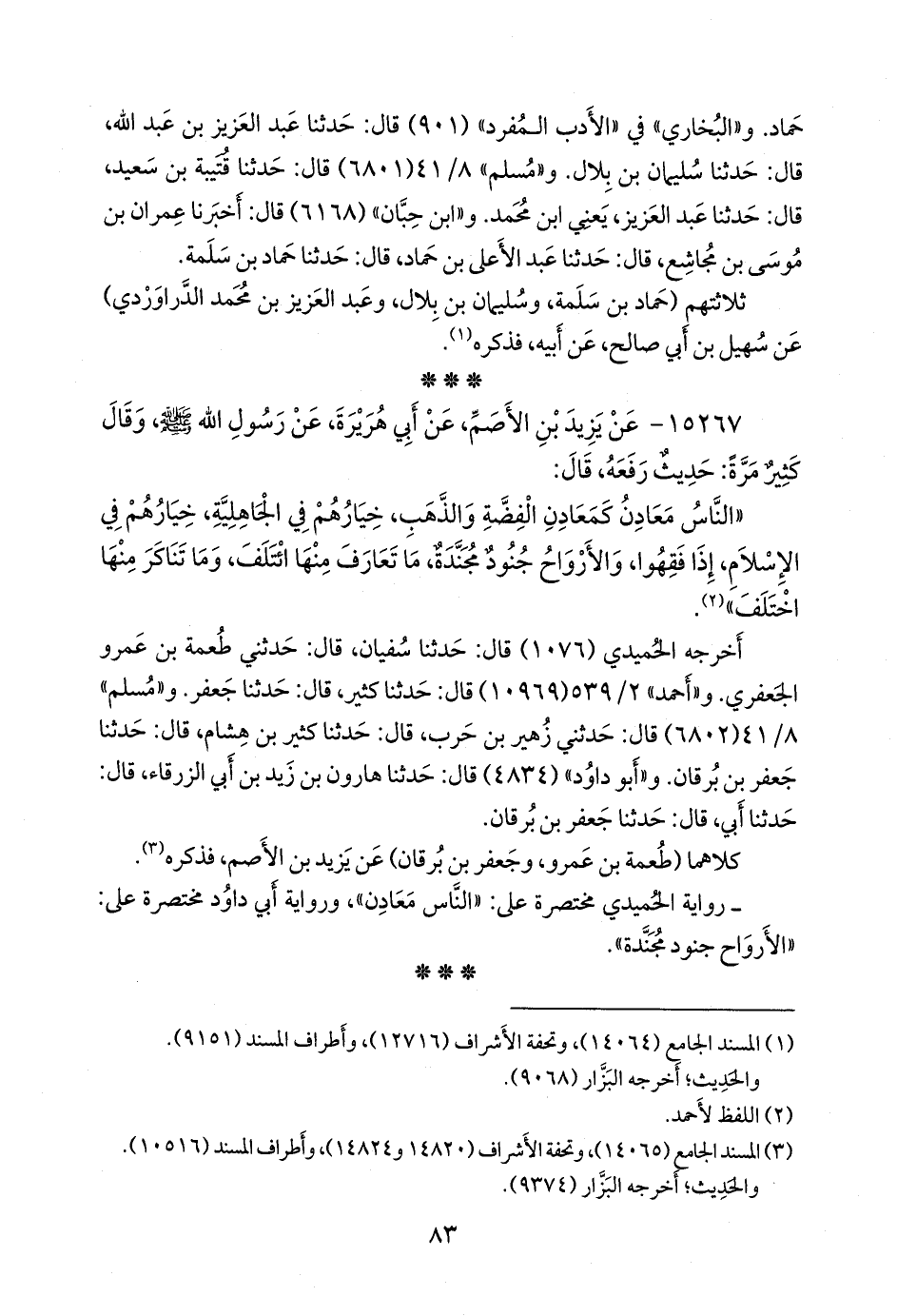- رواية الحميدي مختصرة على: «الناس معادن»، ورواية أبي داود مختصرة على: «الأرواح جنود مجندة».