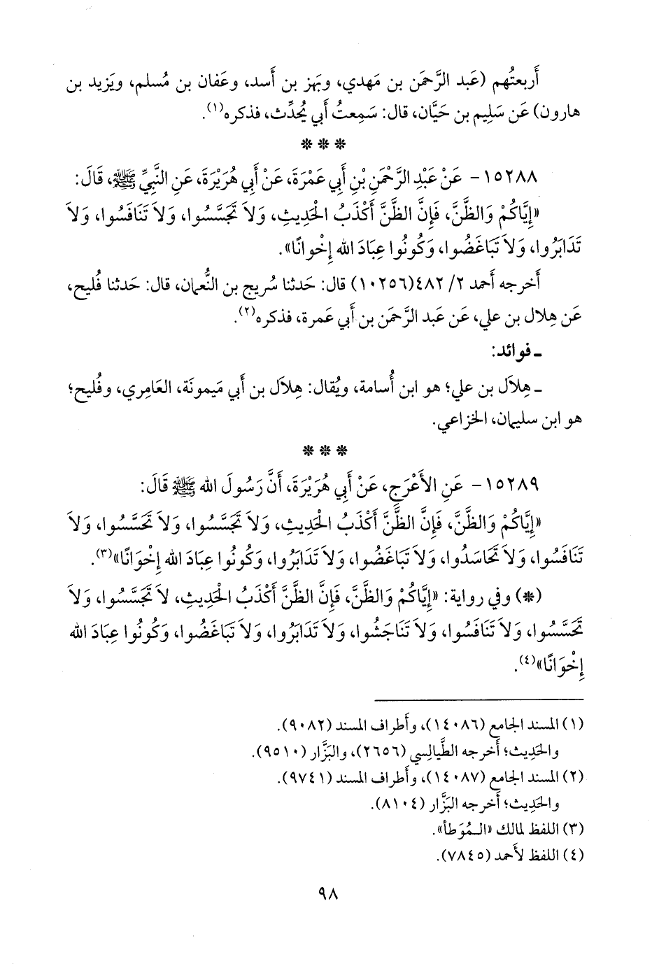 «إياكم والظن، فإن الظن أكذب الحديث، ولا تجسسوا، ولا تنافسوا، ولا تدابروا، ولا تباغضوا، وكونوا عباد الله إخوانا».