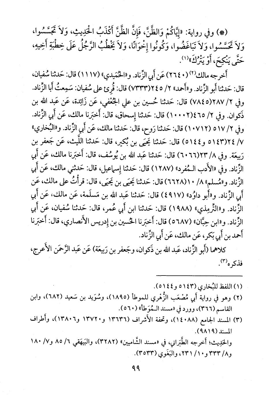 وفي ٢/ ٤٦٥ (١٠٠٠٢) قال: حدثنا إسحاق، قال: أخبرنا مالك، عن أبي الزناد. وفي ٢/ ٥١٧ (١٠٧١٢) قال: حدثنا روح، قال: حدثنا مالك، عن أبي الزناد. و «البخاري» ٧/ ٢٤ (٥١٤٣ و ٥١٤٤) قال: حدثنا يحيى بن بُكير، قال: حدثنا الليث، عن جعفر بن ربيعة. وفي ٨/ ٢٣ (٦٠٦٦) قال: حدثنا عبد الله بن يوسف، قال: أخبرنا مالك، عن أبي الزناد. وفي «الأدب المفرد» (١٢٨٧) قال: حدثنا إسماعيل، قال: حدثني مالك، عن أبي الزناد. و «مسلم» ٨/ ١٠ (٦٦٢٨) قال: حدثنا يحيى بن يحيى، قال: قرأتُ على مالك، عن أبي الزناد. و «أَبو داود» (٤٩١٧) قال: حدثنا عبد الله بن مَسلَمة، عن مالك، عن أبي الزناد. و «التِّرمِذي» (١٩٨٨) قال: حدثنا ابن أبي عمر، قال: حدثنا سفيان، عن أبي الزناد. و «ابن حِبَّان» (٥٦٨٧) قال: أخبرنا الحسين بن إدريس الأَنصاري، قال: أخبرنا أحمد بن أَبي بكر، عن مالك، عن أبي الزناد.