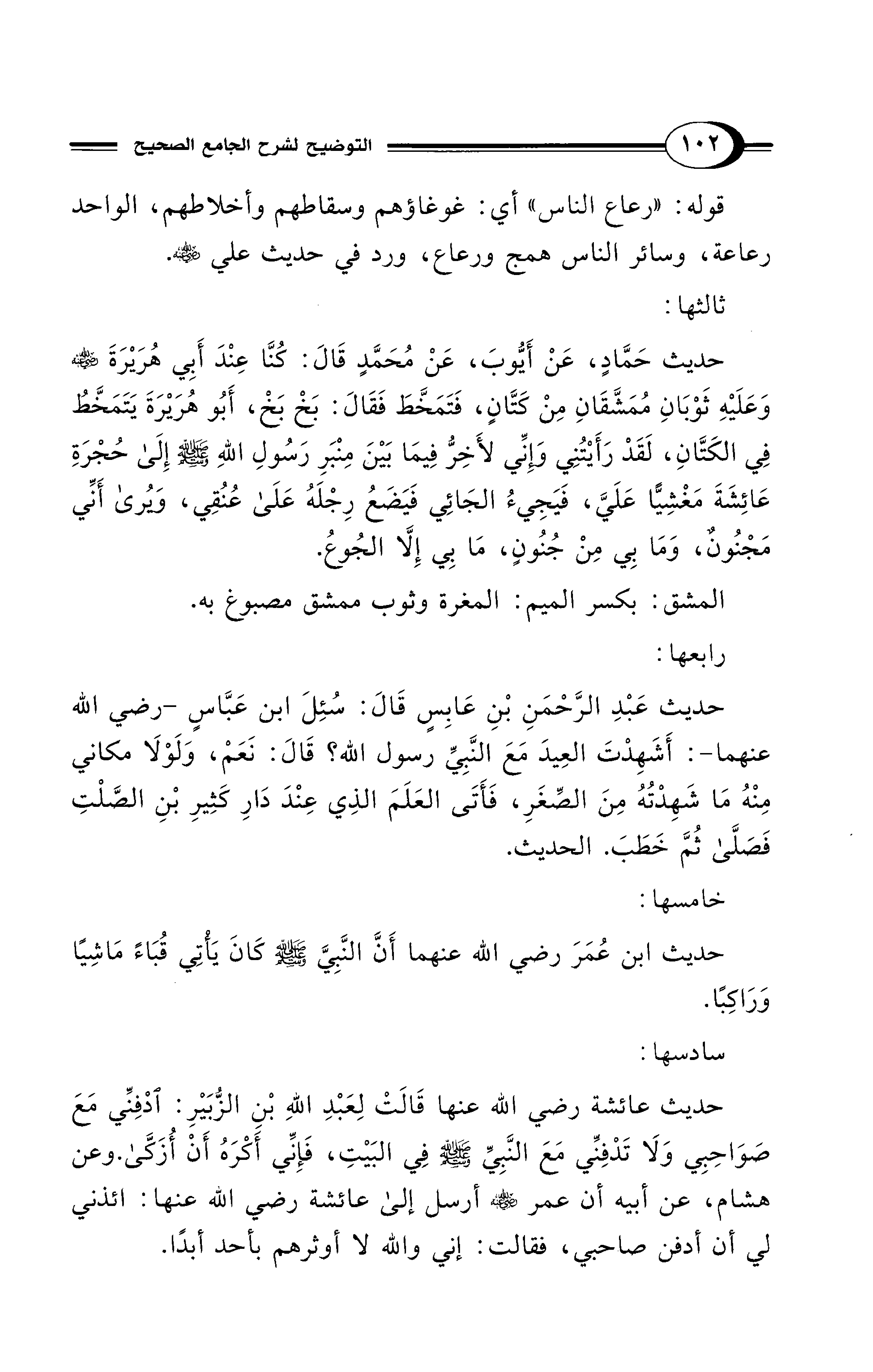 حديث حَمَّادٍ، عَنْ أَيُّوبَ، عَنْ مُحَمَّدٍ قَالَ: كُنَّا عِنْدَ أَبِي هُرَيْرَةَ - رضي الله عنه - وَعَلَيْهِ ثَوْبَانِ مُمَشَّقَانِ مِنْ كَتَّانٍ، فَتَمَخَّطَ فَقَالَ: بَخْ بَخْ، أَبُو هُرَيْرَةَ يَتَمَخَّطُ فِي الكَتَّانِ، لَقَدْ رَأَيْتُنِي وَإِنِّي لأَخِرُّ فِيمَا بَيْنَ مِنْبَرِ رَسُولِ اللهِ - صلى الله عليه وسلم - إِلَي حُجْرَةِ عَائِشَةَ مَغْشِيًّا عَلَيَّ، فَيَجِيءُ الجَائِي فَيَضَعُ رِجْلَهُ عَلَى عُنُقِي، وُيري أَنِّي مَجْنُونٌ، وَمَا بِي مِنْ جُنُونٍ، مَا بِي إِلَّا الجُوعُ.