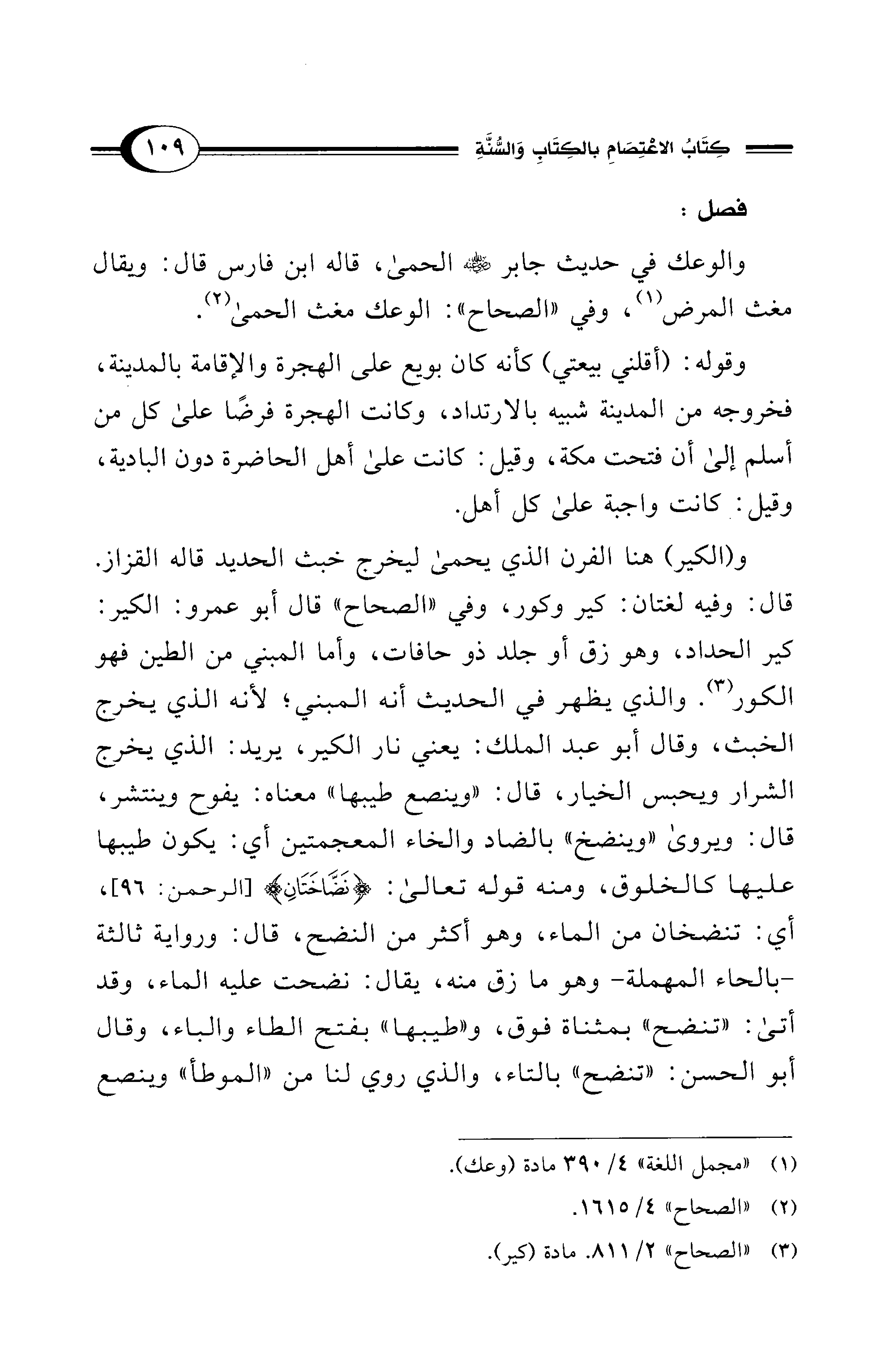 و (الكير) هنا الفرن الذي يحمى ليخرج خبث الحديد قاله القزاز. قال: وفيه لغتان: كير وكور، وفي "الصحاح" قال أبو عمرو: الكير: كير الحداد، وهو زق أو جلد ذو حافات، وأما المبني من الطين فهو الكور (¬3). والذي يظهر في الحديث أنه المبني؛ لأنه الذي يخرج الخبث، وقال أبو عبد الملك: يعني نار الكير، يريد: الذي يخرج الشرار ويحبس الخيار، قال: "وينصع طيبها" معناه: يفوح وينتشر، قال: ويروى "وينضخ" بالضاد والخاء المعجمتين أي: يكون طيبها عليها كالخلوق، ومنه قوله تعالى: {نَضَّاخَتَانِ} [الرحمن: 96]، أي: تنضخان من الماء، وهو أكثر من النضح، قال: ورواية ثالثة -بالحاء المهملة- وهو ما زق منه، يقال: نضحت عليه الماء، وقد أتى: "تنضح" بمثناة فوق، و"طيبها" بفتح الطاء والباء، وقال أبو الحسن: "تنضح" بالتاء، والذي روي لنا من "الموطأ" وينصع