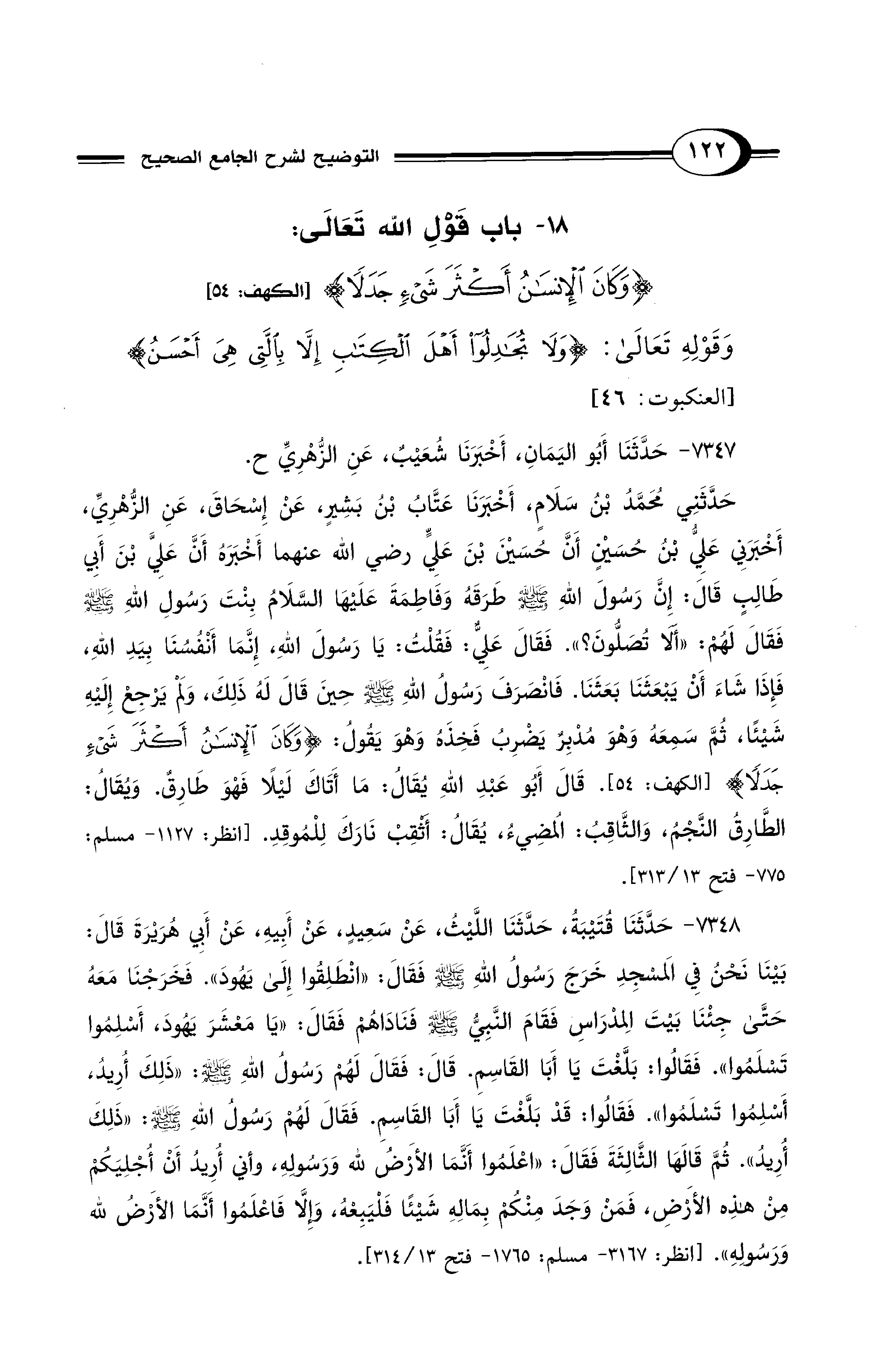 18 - باب قَوْلِ الله تَعَالَى: {وَكَانَ الإِنْسَانُ أَكْثَرَ شَيْءٍ جَدَلاً} [الكهف: 54]