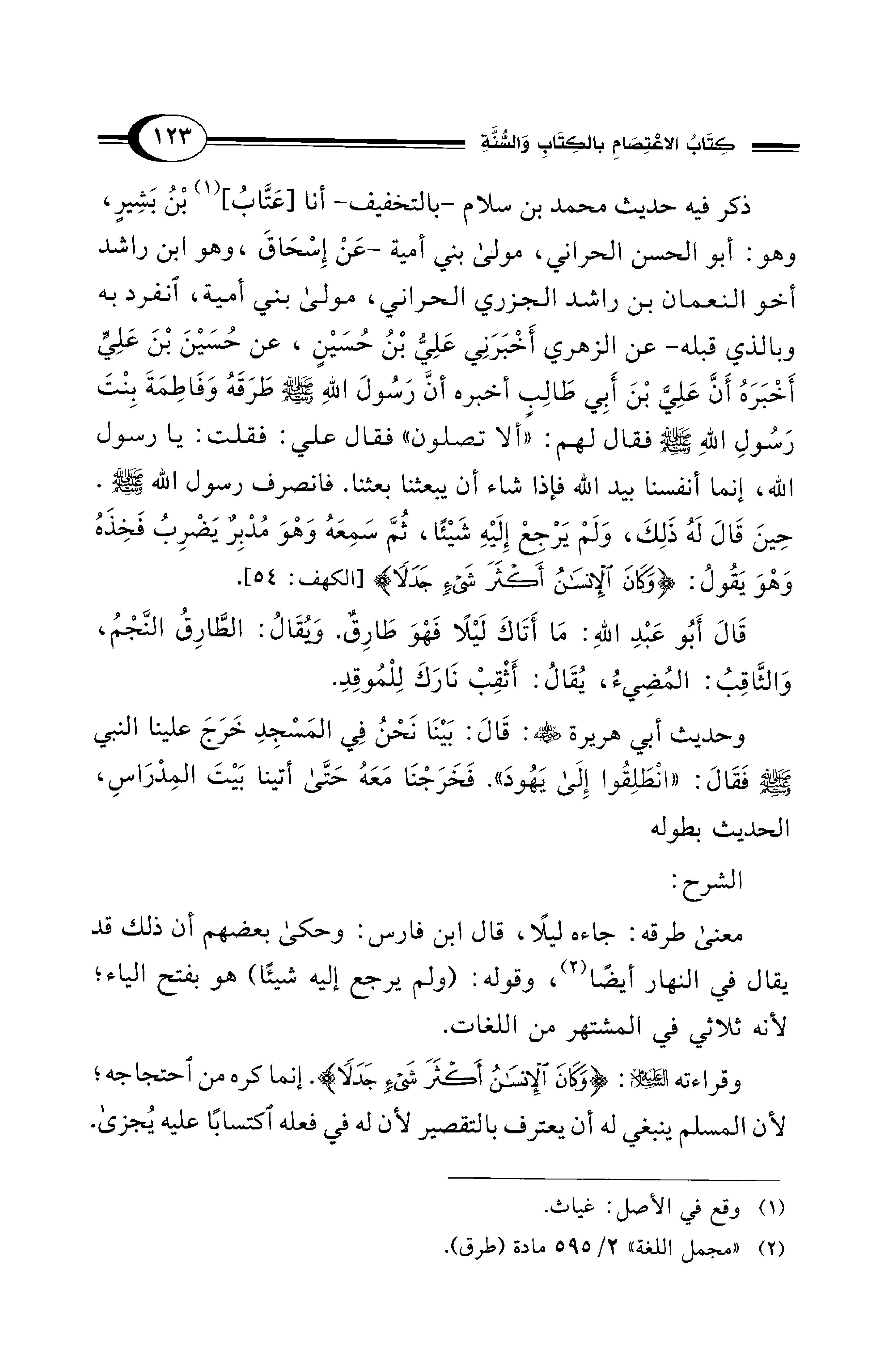 ذكر فيه حديث محمد بن سلام -بالتخفيف- أنا [عَتَّابُ] (¬1) بْنُ بَشِيرٍ، وهو: أبو الحسن الحراني، مولي بني أمية -عَنْ إِسْحَاقَ، وهو ابن راشد أخو النعمان بن راشد الجزري الحراني، مولى بني أمية، انفرد به وبالذي قبله- عن الزهري أَخْبَرَنِي عَلِيُّ بْنُ حُسَيْنٍ، عن حُسَيْنَ بْنَ عَلِيِّ أَخْبَرَهُ أَنَّ عَلِيَّ بْنَ أَبِي طَالِبٍ أخبره أنَّ رَسُولَ اللهِ - صلى الله عليه وسلم - طَرَقَهُ وَفَاطِمَةَ بِنْتَ رَسُولِ اللهِ - صلى الله عليه وسلم - فقال لهم: "ألا تصلون" فقال علي: فقلت: يا رسول الله، إنما أنفسنا بيد الله فإذا شاء أن يبعثنا بعثنا. فانصرف رسول الله - صلى الله عليه وسلم -. حِينَ قَالَ لَهُ ذَلِكَ، وَلَمْ يَرْجِعْ إِلَيْهِ شَيْئًا، ثُمَّ سَمِعَهُ وَهْوَ مُدْبِرٌ يَضرِبُ فَخِذَهُ وَهْوَ يَقُولُ: {وَكَانَ الْإِنْسَانُ أَكْثَرَ شَيْءٍ جَدَلًا} [الكهف: 54].