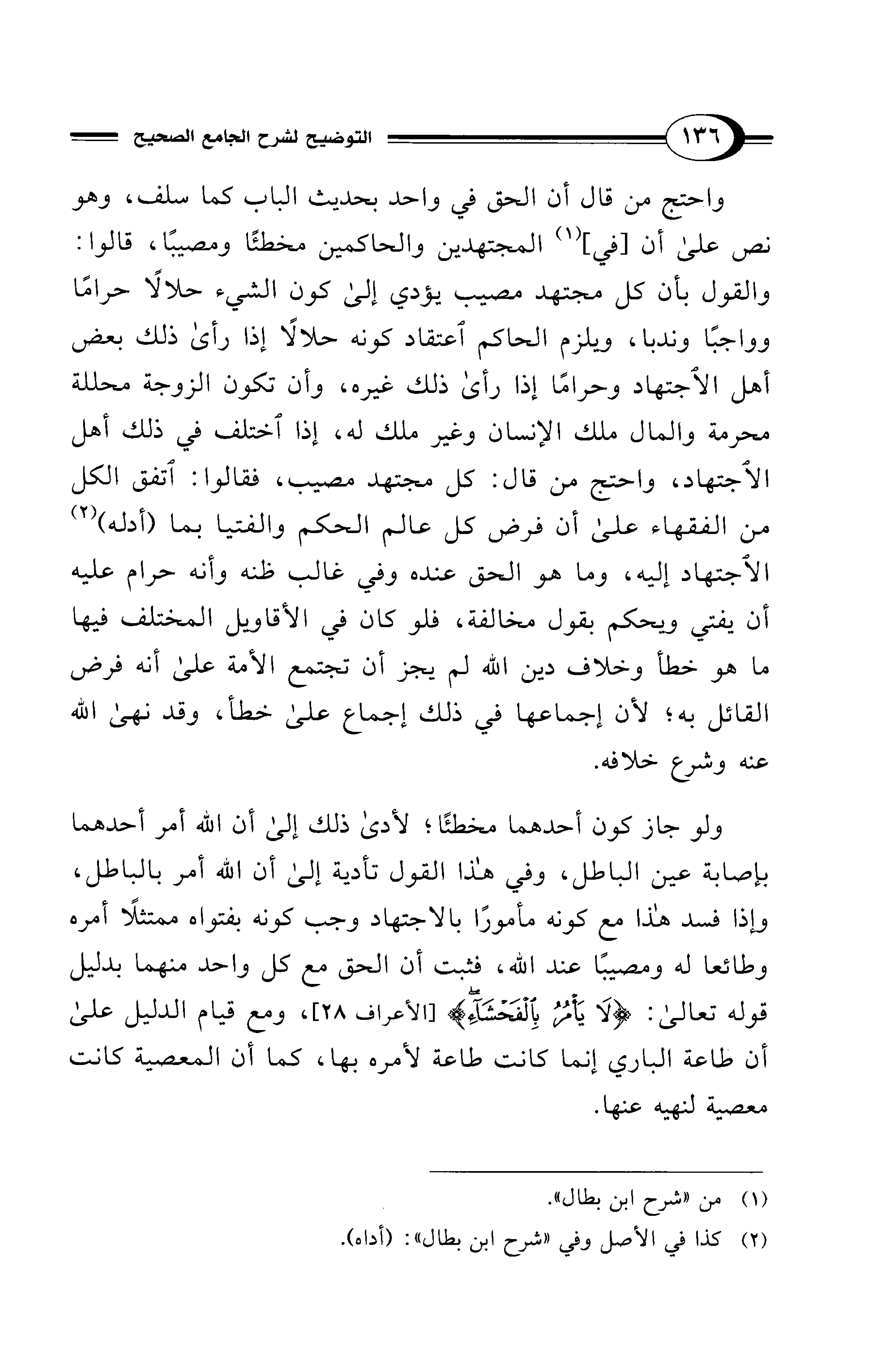 ولو جاز كون أحدهما مخطئًا؛ لأدى ذلك إلى أن الله أمر أحدهما بإصابة عين الباطل، وفي هذا القول تأدية إلا أن الله أمر بالباطل، وإذا فسد هذا مع كونه مأمورًا بالاجتهاد وجب كونه بفتواه ممتثلًا أمره وطائعا له ومصيبًا عند الله، فثبت أن الحق مع كل واحد منهما بدليل قوله تعالى: {لَا يَأْمُرُ بِالْفَحْشَاءِ} [الأعراف: 28]، ومع قيام الدليل على أن طاعة الباري إنما كانت طاعة لأمره بها، كما أن المعصية كانت معصية لنهيه عنها.