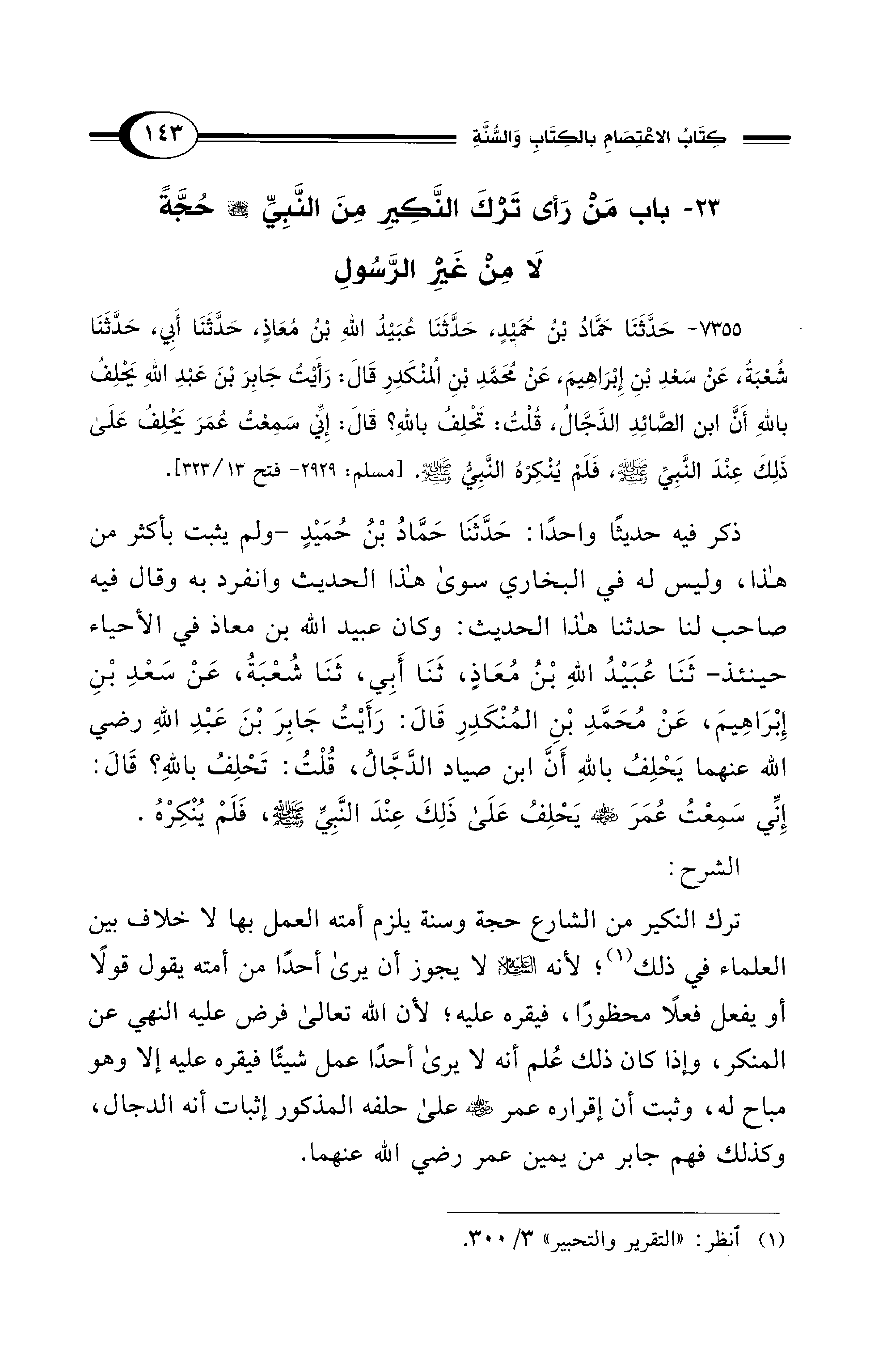 7355 - حَدَّثَنَا حَمَّادُ بْنُ حُمَيْدٍ، حَدَّثَنَا عُبَيْدُ اللهِ بْنُ مُعَاذٍ، حَدَّثَنَا أَبِي، حَدَّثَنَا شُعْبَةُ، عَنْ سَعْدِ بْنِ إِبْرَاهِيمَ، عَنْ مُحَمَّدِ بْنِ المُنْكَدِرِ قَالَ: رَأَيْتُ جَابِرَ بْنَ عَبْدِ اللهِ يَحْلِفُ بِاللهِ أَنَّ ابْنَ الصَّائِدِ الدَّجَّالُ، قُلْتُ: تَحْلِفُ بِاللهِ؟ قَالَ: إِنِّي سَمِعْتُ عُمَرَ يَحْلِفُ عَلَى ذَلِكَ عِنْدَ النَّبِيِّ - صلى الله عليه وسلم -، فَلَمْ يُنْكِرْهُ النَّبِيُّ - صلى الله عليه وسلم -. [مسلم: 2929 - فتح 13/ 323].