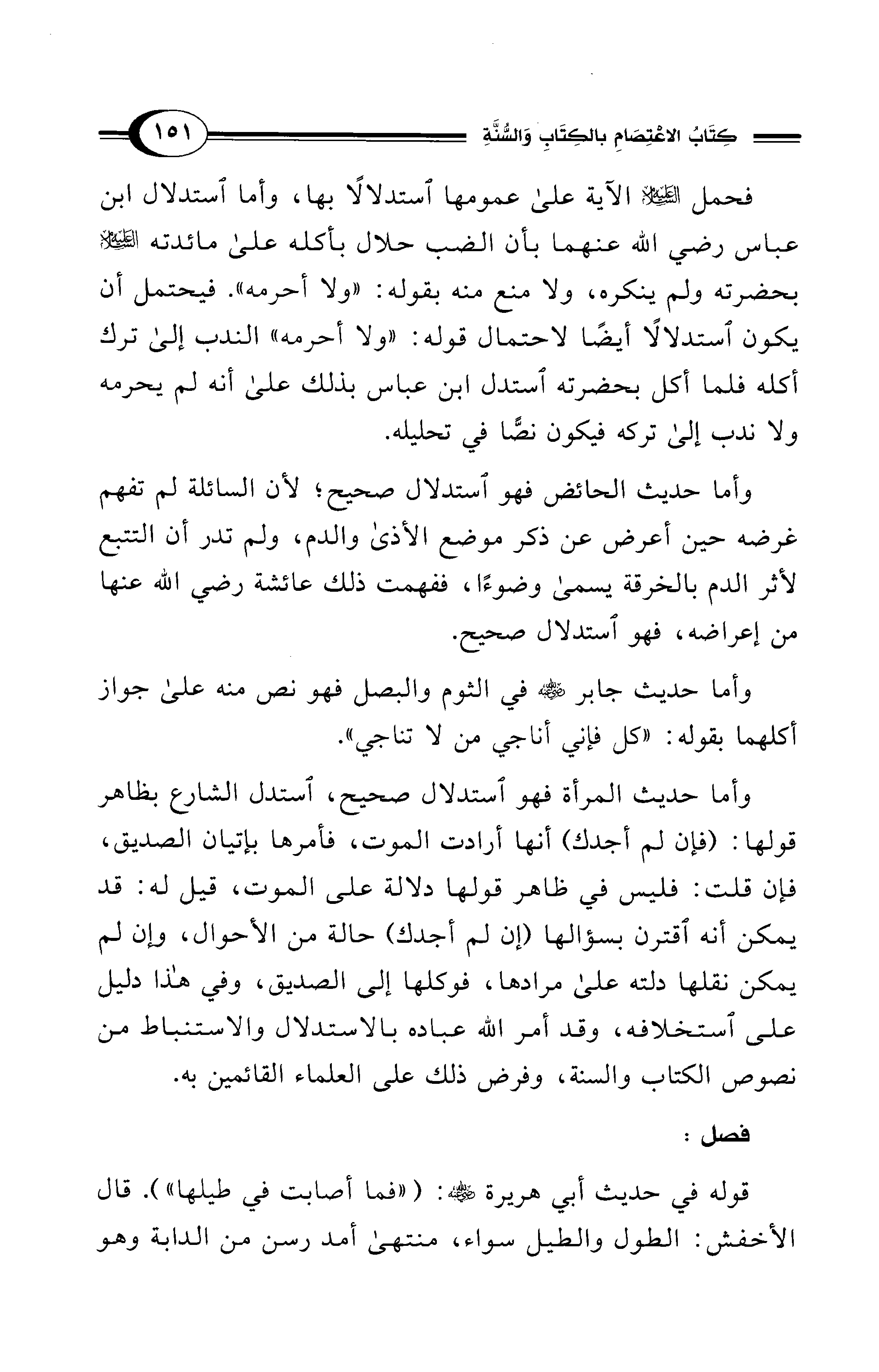 وأما حديث الحائض فهو استدلال صحيح؛ لأن السائلة لم تفهم غرضه حين أعرض عن ذكر موضع الأذى والدم، ولم تدر أن التتبع لأثر الدم بالخرقة يسما وضوءًا، ففهمت ذلك عائشة - رضي الله عنها - من إعراضه، فهو استدلال صحيح.
