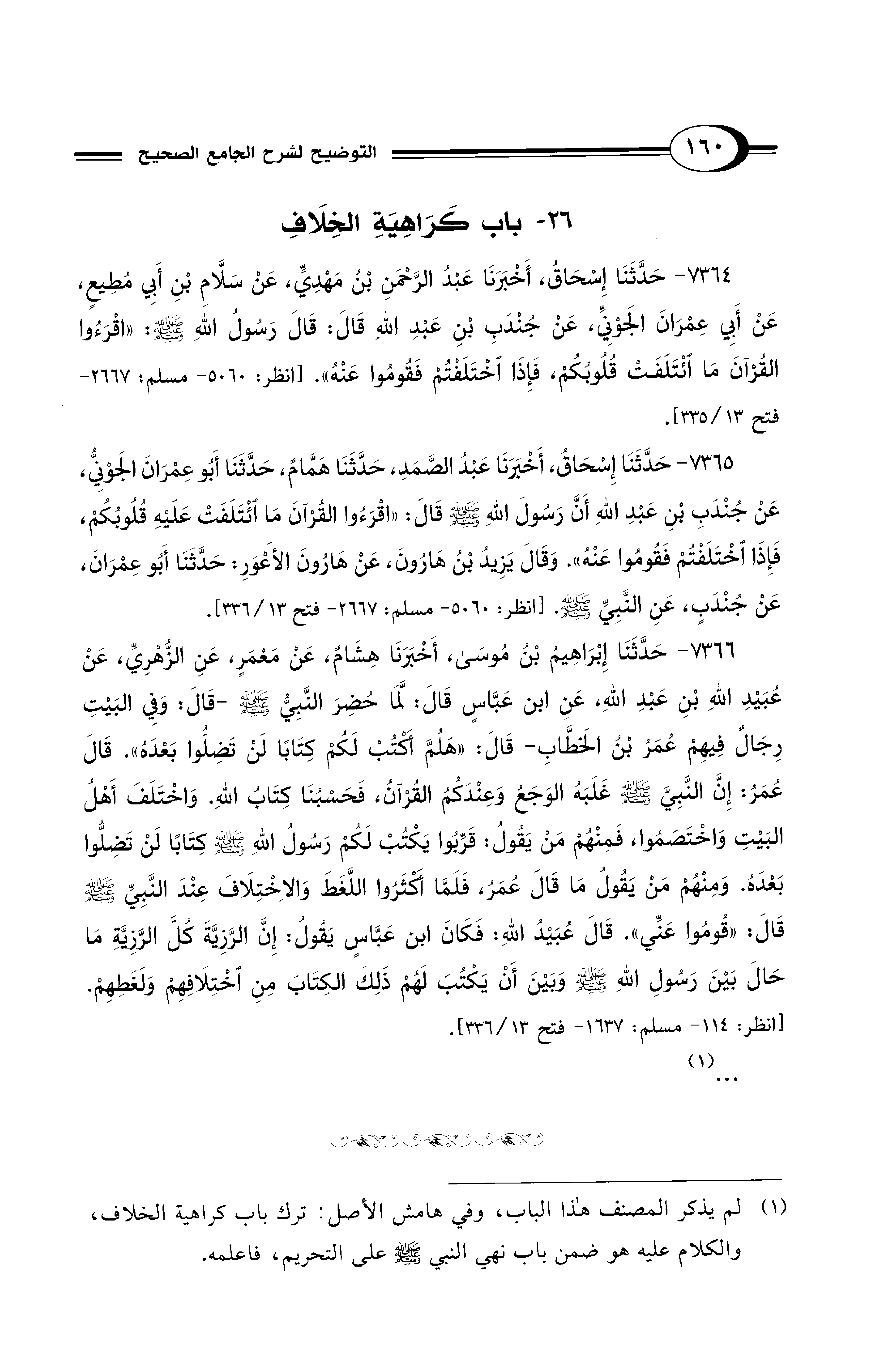 7364 - حَدَّثَنَا إِسْحَاقُ، أَخْبَرَنَا عَبْدُ الرَّحْمَنِ بْنُ مَهْدِيٍّ، عَنْ سَلاَّمِ بْنِ أَبِي مُطِيعٍ، عَنْ أَبِي عِمْرَانَ الجَوْنِيِّ، عَنْ جُنْدَبِ بْنِ عَبْدِ اللهِ قَالَ: قَالَ رَسُولُ اللهِ - صلى الله عليه وسلم -: «اقْرَءُوا الْقُرْآنَ مَا ائْتَلَفَتْ قُلُوبُكُمْ، فَإِذَا اخْتَلَفْتُمْ فَقُومُوا عَنْهُ». [انظر: 5060 - مسلم: 2667 - فتح 13/ 335].