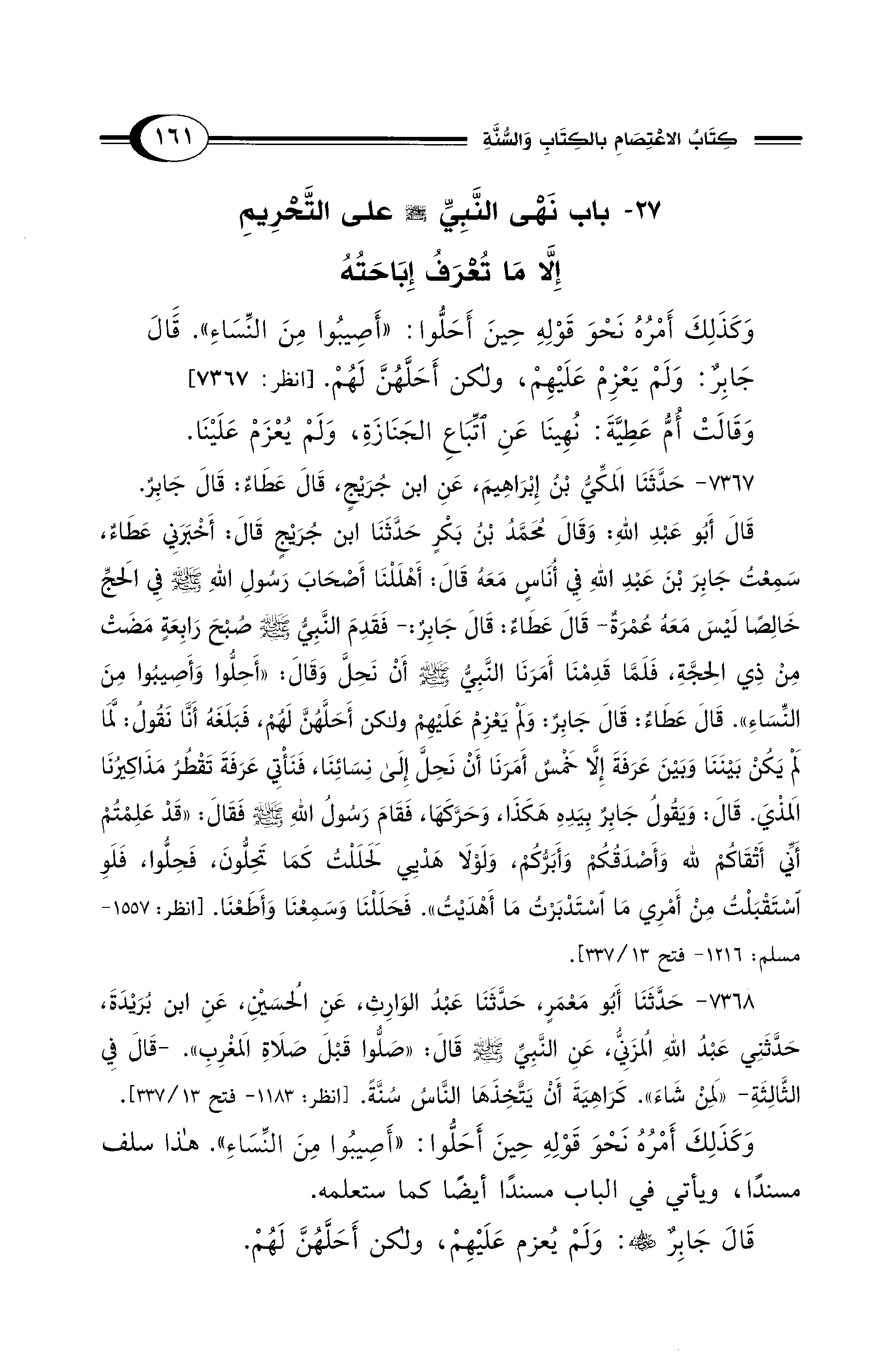 7367 - حَدَّثَنَا المَكِّيُّ بْنُ إِبْرَاهِيمَ، عَنِ ابْنِ جُرَيْجٍ، قَالَ عَطَاءٌ: قَالَ جَابِرٌ. قَالَ أَبُو عَبْدِ اللهِ: وَقَالَ مُحَمَّدُ بْنُ بَكْرٍ حَدَّثَنَا ابْنُ جُرَيْجٍ قَالَ: أَخْبَرَنِي عَطَاءٌ، سَمِعْتُ جَابِرَ بْنَ عَبْدِ اللهِ فِي أُنَاسٍ مَعَهُ قَالَ: أَهْلَلْنَا أَصْحَابَ رَسُولِ اللهِ - صلى الله عليه وسلم - فِي الحَجِّ خَالِصًا لَيْسَ مَعَهُ عُمْرَةٌ -قَالَ عَطَاءٌ: قَالَ جَابِرٌ:- فَقَدِمَ النَّبِيُّ - صلى الله عليه وسلم - صُبْحَ رَابِعَةٍ مَضَتْ مِنْ ذِي الحِجَّةِ، فَلَمَّا قَدِمْنَا أَمَرَنَا النَّبِيُّ - صلى الله عليه وسلم - أَنْ نَحِلَّ وَقَالَ: «أَحِلُّوا وَأَصِيبُوا مِنَ النِّسَاءِ». قَالَ عَطَاءٌ: قَالَ جَابِرٌ: وَلَمْ يَعْزِمْ عَلَيْهِمْ وَلَكِنْ أَحَلَّهُنَّ لَهُمْ، فَبَلَغَهُ أَنَّا نَقُولُ: لَمَّا لَمْ يَكُنْ بَيْنَنَا وَبَيْنَ عَرَفَةَ إِلاَّ خَمْسٌ أَمَرَنَا أَنْ نَحِلَّ إِلَى نِسَائِنَا، فَنَأْتِي عَرَفَةَ تَقْطُرُ مَذَاكِيرُنَا المَذْيَ قَالَ: وَيَقُولُ جَابِرٌ بِيَدِهِ هَكَذَا، وَحَرَّكَهَا، فَقَامَ رَسُولُ اللهِ - صلى الله عليه وسلم - فَقَالَ: «قَدْ عَلِمْتُمْ أَنِّي أَتْقَاكُمْ لِلَّهِ وَأَصْدَقُكُمْ وَأَبَرُّكُمْ، وَلَوْلاَ هَدْيِي لَحَلَلْتُ كَمَا تَحِلُّونَ فَحِلُّوا، فَلَوِ اسْتَقْبَلْتُ مِنْ أَمْرِي مَا اسْتَدْبَرْتُ مَا أَهْدَيْتُ». فَحَلَلْنَا وَسَمِعْنَا وَأَطَعْنَا. [انظر: 1557 - مسلم: 1216 - فتح 13/ 337].