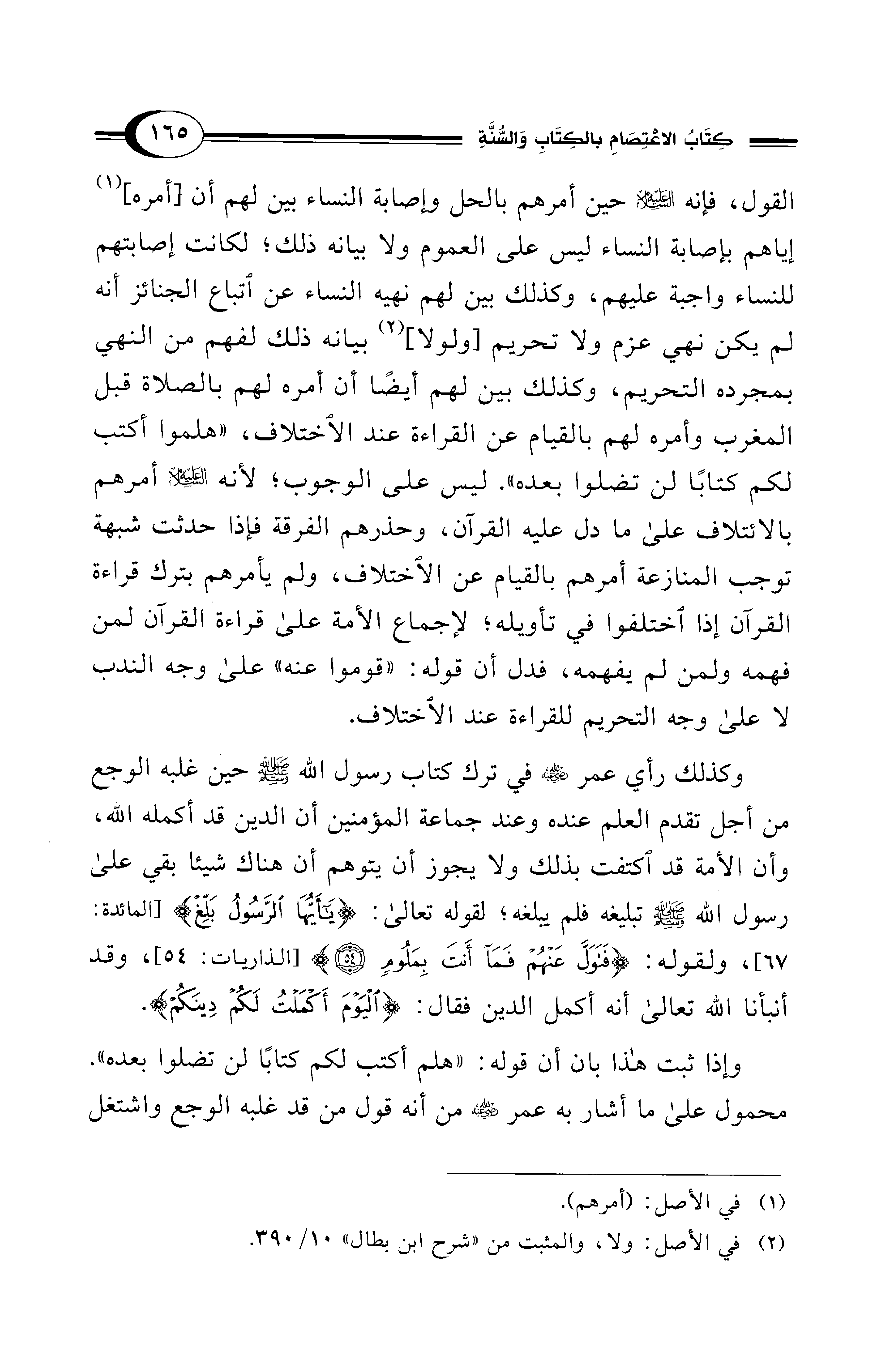 وكذلك رأي عمر - رضي الله عنه - في ترك كتاب رسول الله - صلى الله عليه وسلم - حين غلبه الوجع من أجل تقدم العلم عنده وعند جماعة المؤمنين أن الدين قد أكمله الله، وأن الأمة قد اكتفت بذلك ولا يجوز أن يتوهم أن هناك شيئا بقي على رسول الله - صلى الله عليه وسلم - تبليغه فلم يبلغه؛ لقوله تعالى: {يَا أَيُّهَا الرَّسُولُ بَلِّغْ} [المائدة: 67]، ولقوله: {فَتَوَلَّ عَنْهُمْ فَمَا أَنْتَ بِمَلُومٍ (54)} [الذاريات: 54]، وقد أنبأنا الله تعالى أنه أكمل الدين فقال: {الْيَوْمَ أَكْمَلْتُ لَكُمْ دِينَكُمْ}.