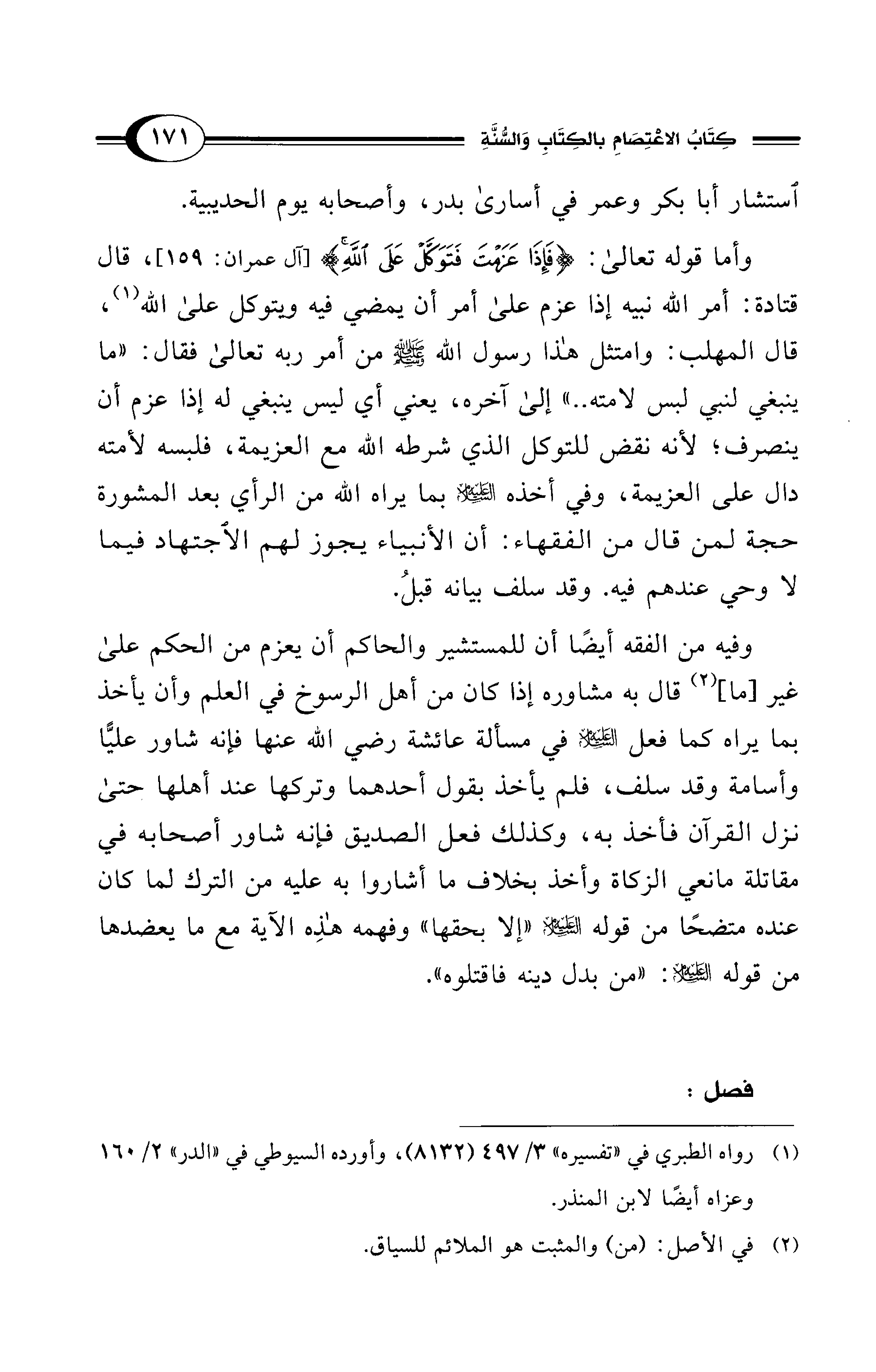 وأما قوله تعالى: {فَإِذَا عَزَمْتَ فَتَوَكَّلْ عَلَى اللهِ} [آل عمران: 159]، قال قتادة: أمر الله نبيه إذا عزم علي أمر أن يمضي فيه ويتوكل علي الله (¬1)، قال المهلب: وامتثل هذا رسول الله - صلى الله عليه وسلم - من أمر ربه تعالى فقال: "ما ينبغي لنبي لبس لامته .. " إلى آخره، يعني أي ليس ينبغي له إذا عزم أن ينصرف؛ لأنه نقض للتوكل الذي شرطه الله مع العزيمة، فلبسه لأمته دال على العزيمة، وفي أخذه - عليه السلام - بما يراه الله من الرأي بعد المشورة حجة لمن قال من الفقهاء: أن الأنبياء يجوز لهم الاجتهاد فيما لا وحي عندهم فيه. وقد سلف بيانه قبلُ.