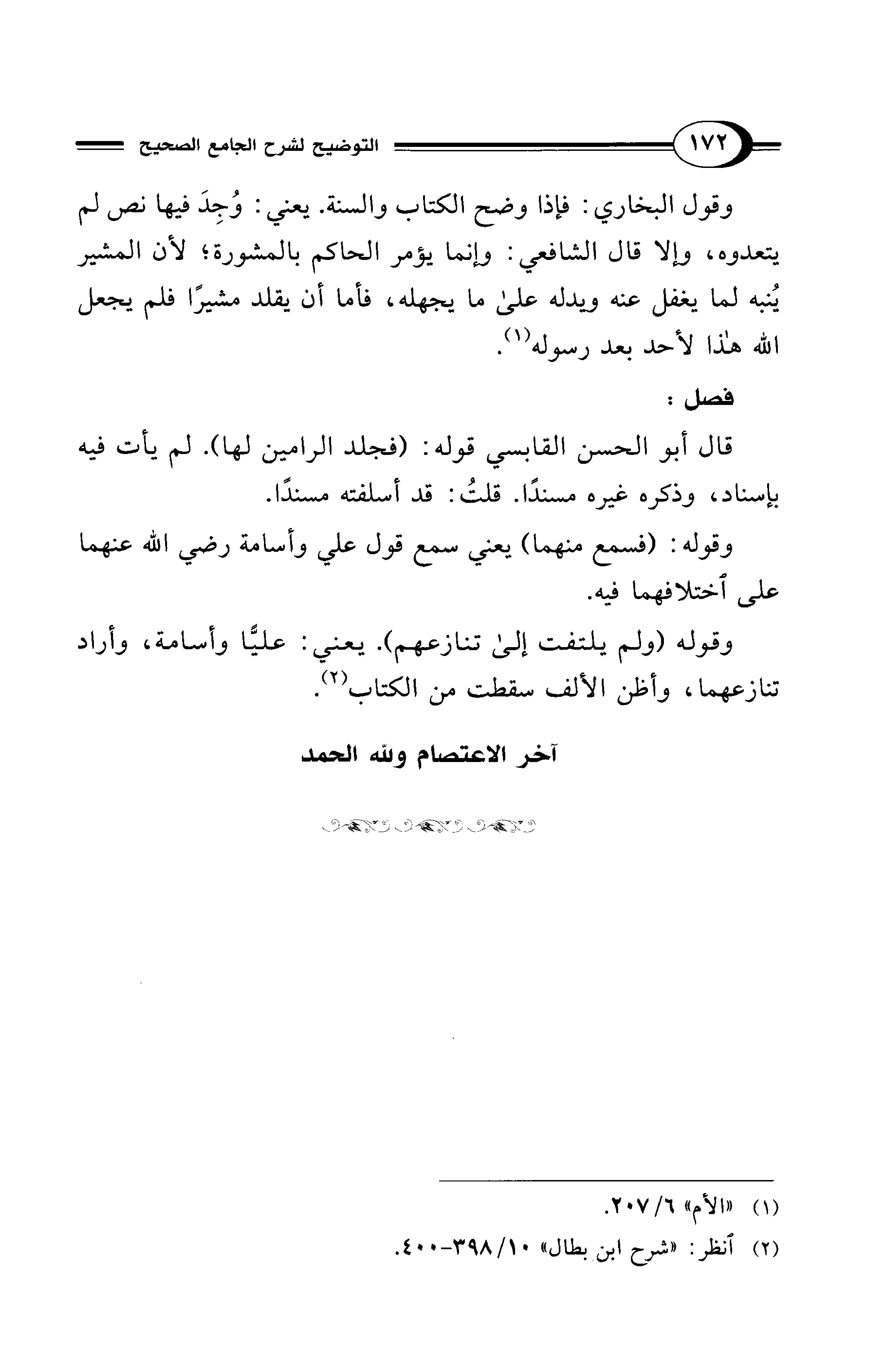 وقول البخاري: فإذا وضح الكتاب والسنة. يعني: وُجِدَ فيها نص لم يتعدوه، وإلا قال الشافعي: وإنما يؤمر الحاكم بالمشورة؛ لأن المشير يُنبه لما يغفل عنه ويدله على ما يجهله، فأما أن يقلد مشيرًا فلم يجعل الله هذا لأحد بعد رسوله (¬1).