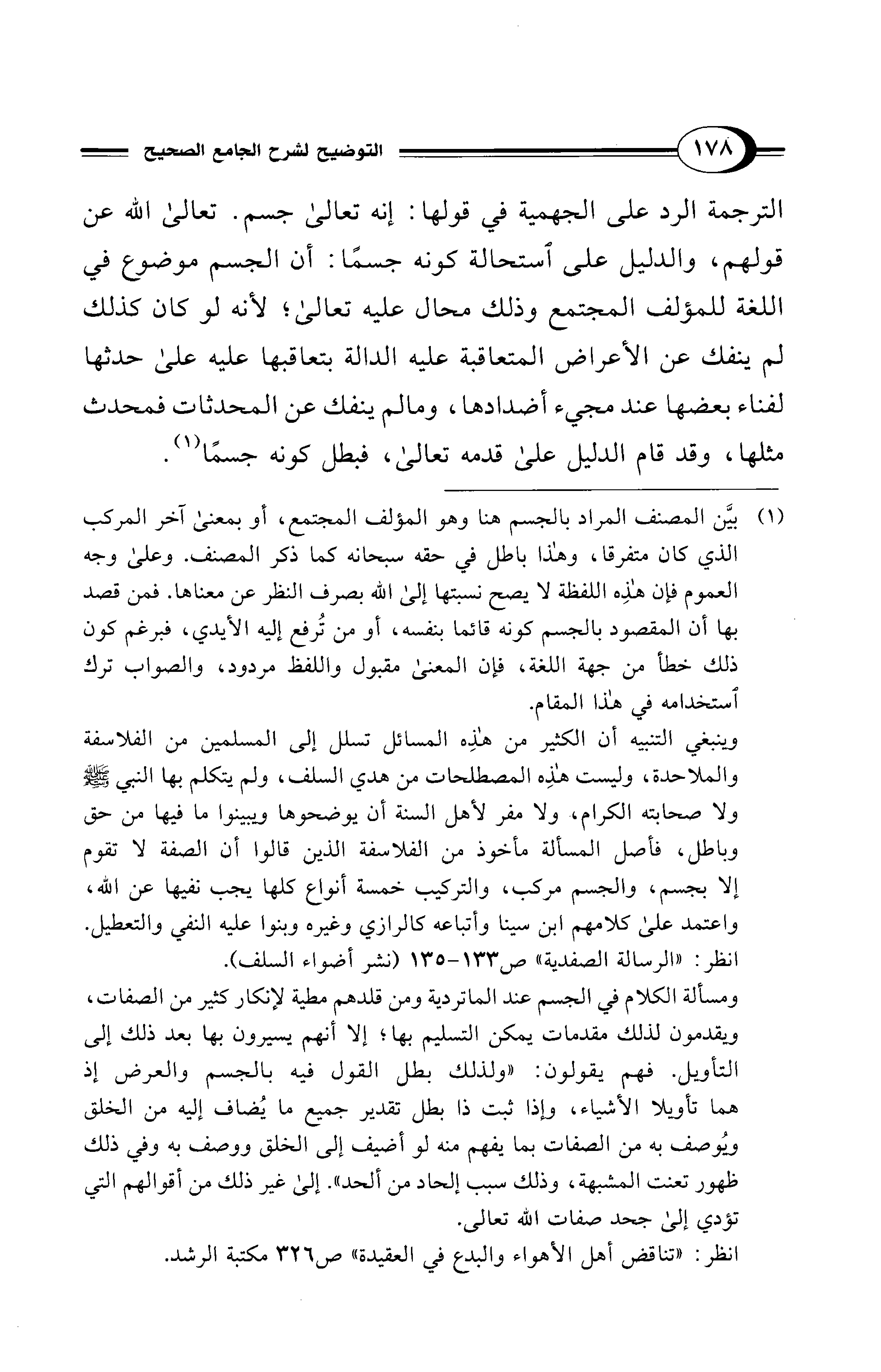 (¬1) بيَّن المصنف المراد بالجسم هنا وهو المؤلف المجتمع، أو بمعنى آخر المركب الذي كان متفرقا، وهذا باطل في حقه سبحانه كما ذكر المصنف. وعلى وجه العموم فإن هذِه اللفظة لا يصح نسبتها إلى الله بصرف النظر عن معناها. فمن قصد بها أن المقصود بالجسم كونه قائما بنفسه، أو من تُرفع إليه الأيدي، فبرغم كون ذلك خطأ من جهة اللغة، فإن المعنى مقبول واللفظ مردود، والصواب ترك استخدامه في هذا المقام.