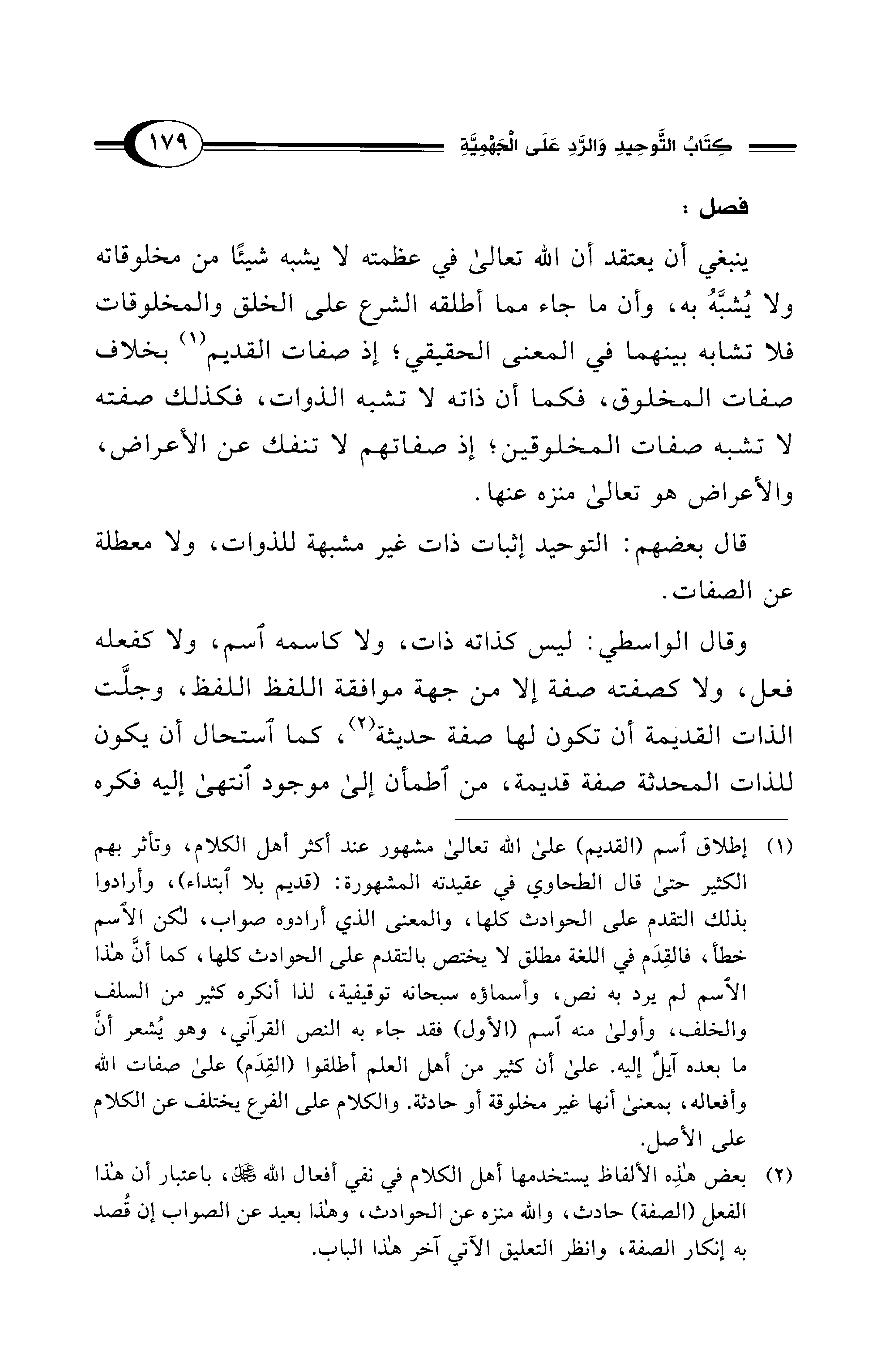 (¬1) إطلاق اسم (القديم) علي الله تعالى مشهور عند أكثر أهل الكلام، وتأثر بهم الكثير حتى قال الطحاوي في عقيدته المشهورة: (قديم بلا ابتداء)، وأرادوا بذلك المتقدم على الحوادث كلها، والمعنى الذي أرادوه صواب، لكن الاسم خطأ، فالقِدَم في اللغة مطلق لا يختص بالتقدم على الحوادث كلها، كما أنَّ هذا الاسم لم يرد به نص، وأسماؤه سبحانه توقيفية، لذا أنكره كثير من السلف والخلف، وأولى منه اسم (الأول) فقد جاء به النص القرآني، وهو يُشعر أنَّ ما بعده آيلٌ إليه. علي أن كثير من أهل العلم أطلقوا (القِدَم) على صفات الله وأفعاله، بمعني أنها غير مخلوقة أو حادثة. والكلام على الفرع يختلف عن الكلام على الأصل.