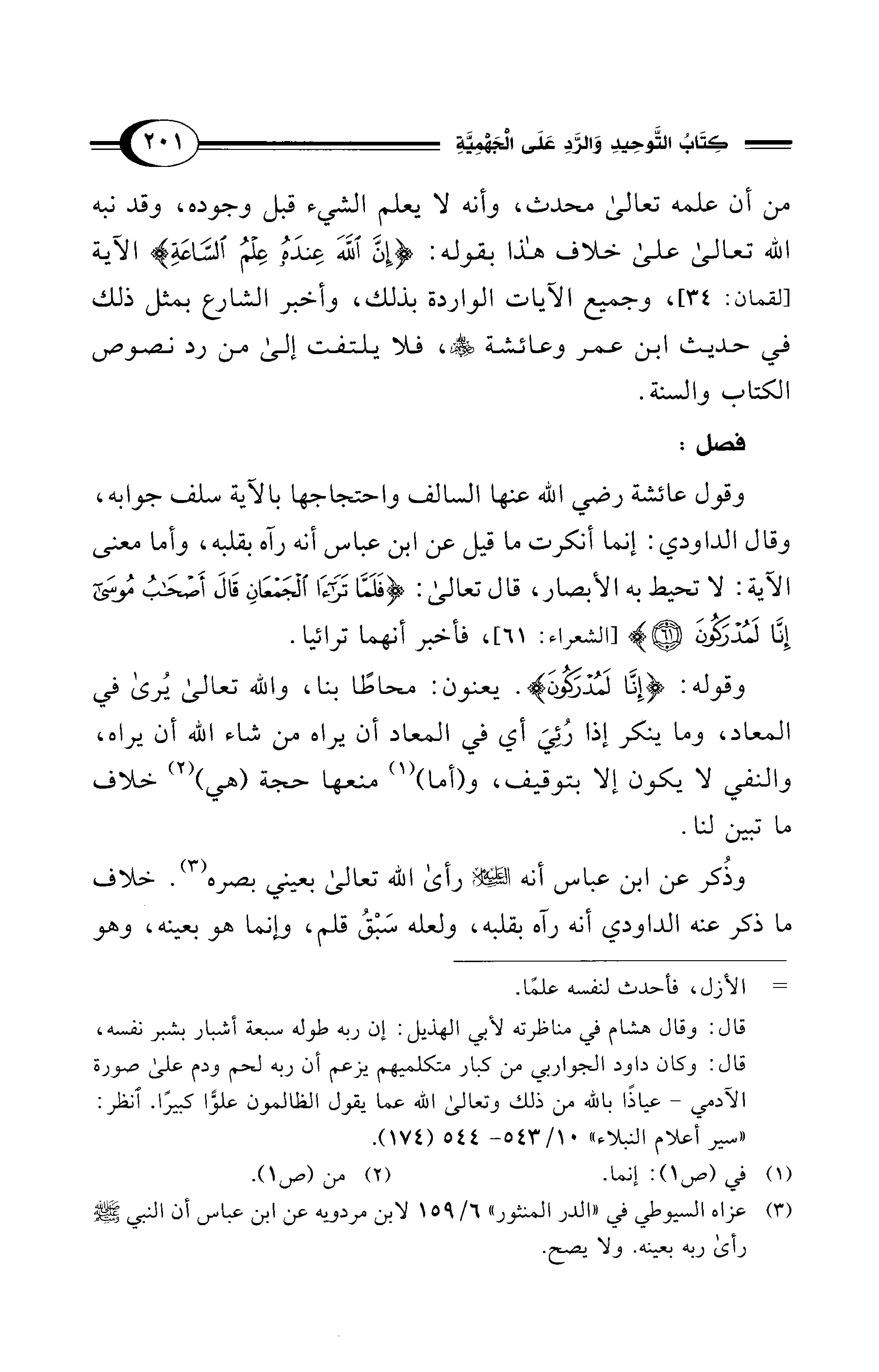 (¬3) عزاه السيوطي في "الدر المنثور" 6/ 159 لابن مردويه عن ابن عباس أن النبي - صلى الله عليه وسلم - رأى ربه بعينه. ولا يصح.