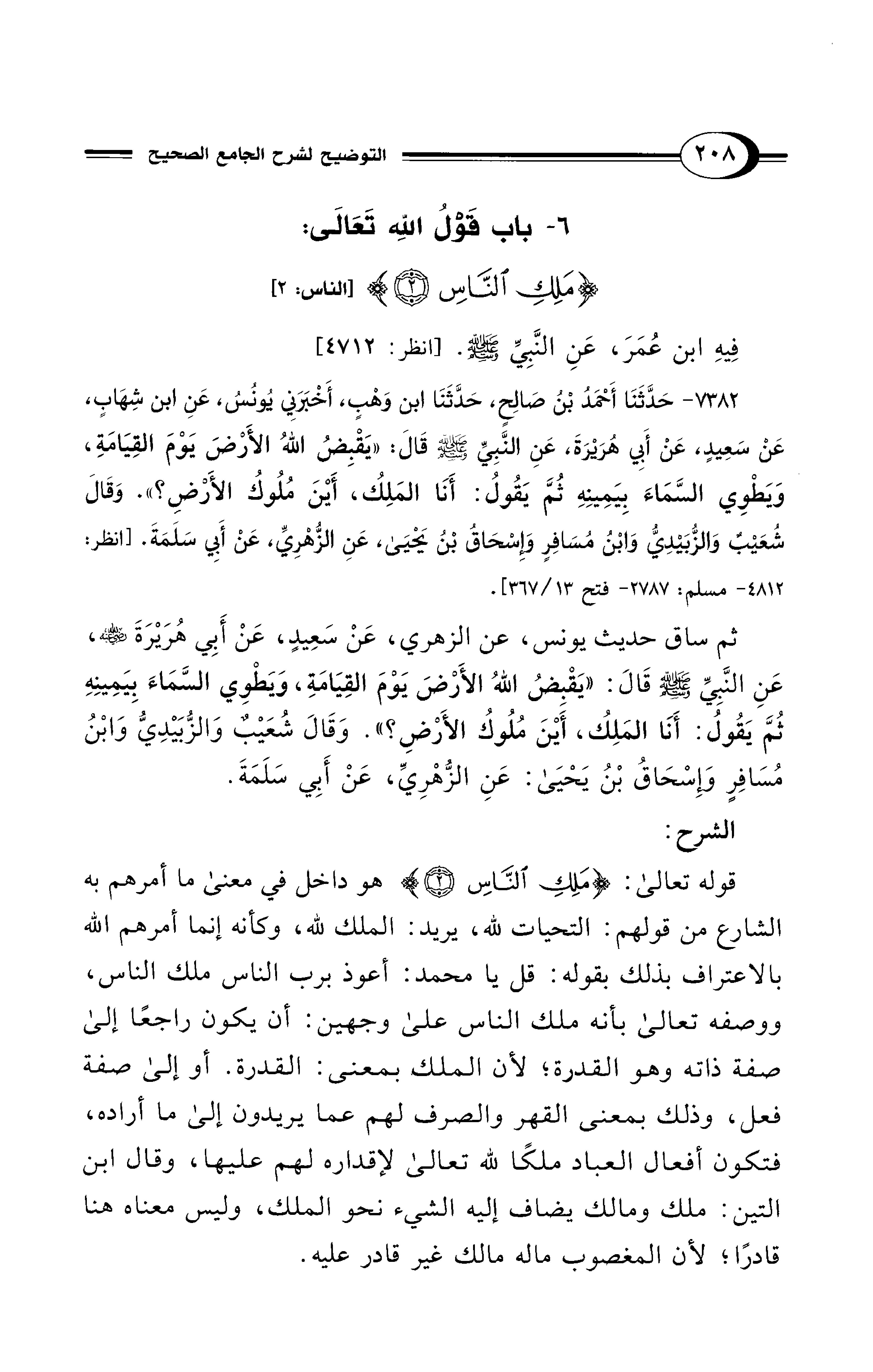 6 - باب قَوْلِ اللهِ تَعَالَى: {مَلِكِ النَّاسِ (2)} [الناس: 2]
