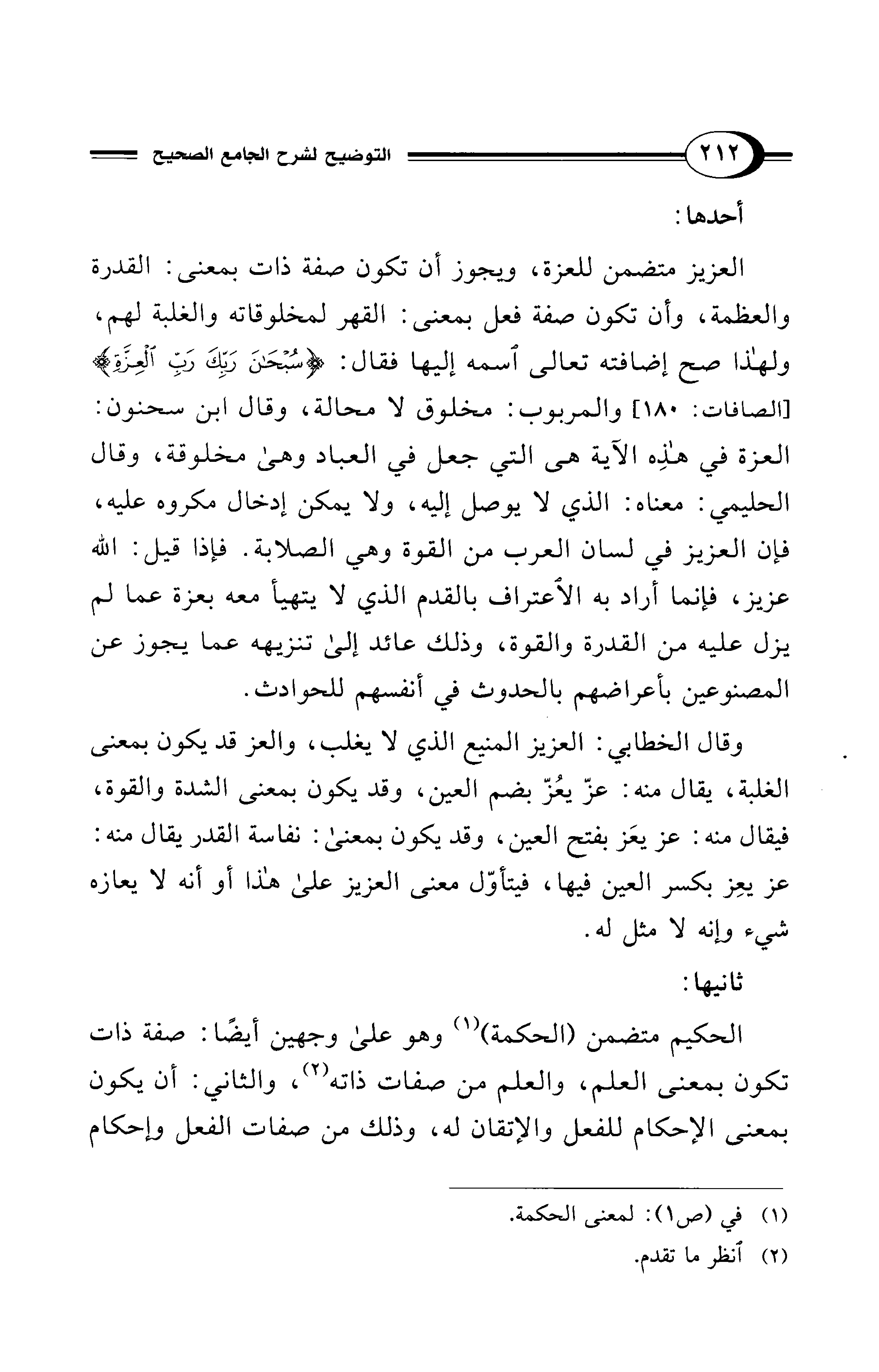 الحكيم متضمن (الحكمة) (¬1) وهو على وجهين أيضًا: صفة ذات تكون بمعنى العلم، والعلم من صفات ذاته (¬2)، والثاني: أن يكون بمعنى الأحكام للفعل والإتقان له، وذلك من صفات الفعل وإحكام