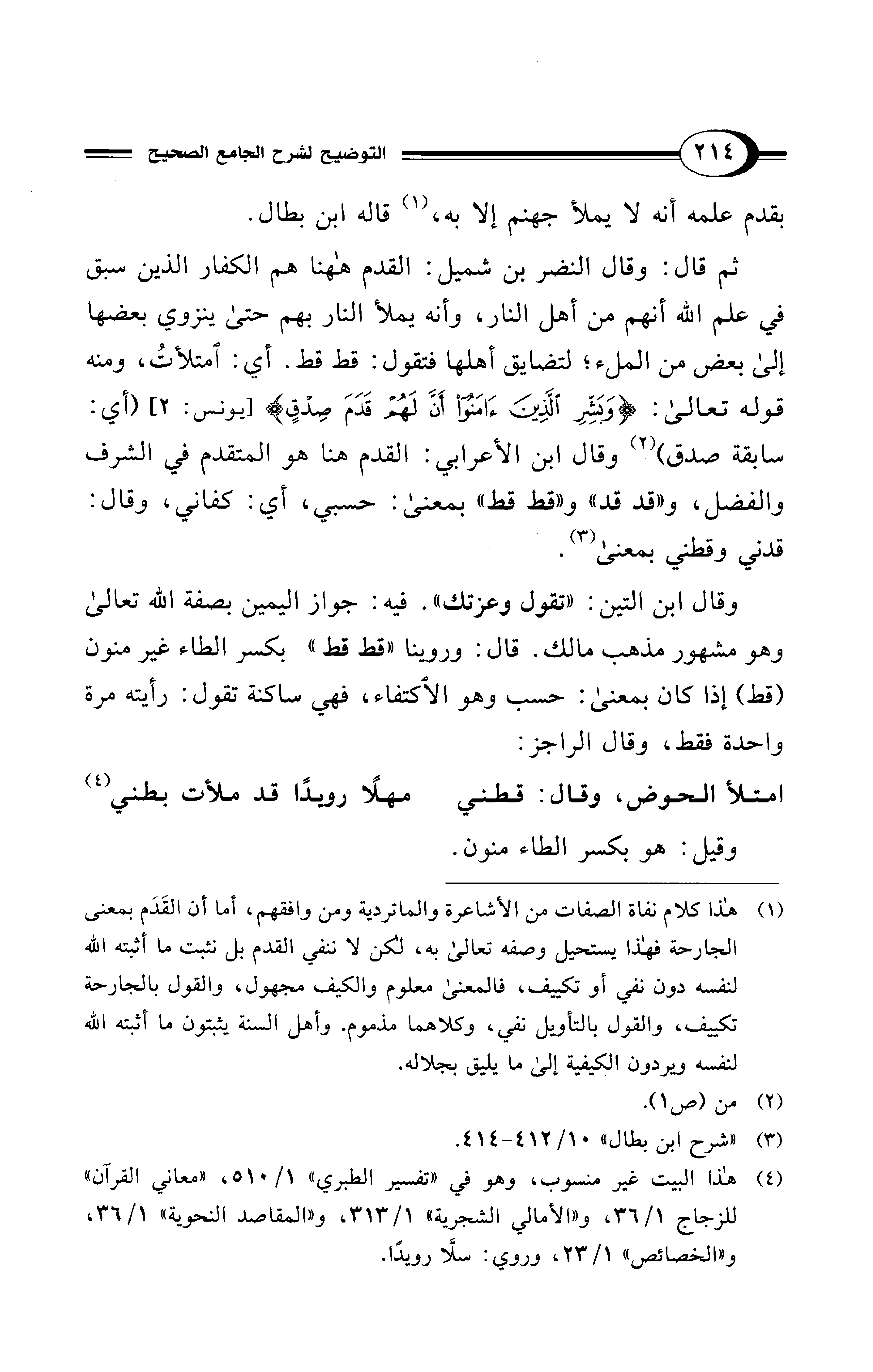 (¬1) هذا كلام نفاة الصفات من الأشاعرة والماتردية ومن وافقهم، أما أن القَدَم بمعنى الجارحة فهذا يستحيل وصفه تعالى به، لكن لا ننفي القدم بل نثبت ما أثبته الله لنفسه دون نفي أو تكييف، فالمعني معلوم والكيف مجهول، والقول بالجارحة تكييف، والقول بالتأويل نفي، وكلاهما مذموم. وأهل السنة يثبتون ما أثبته الله لنفسه ويردون الكيفية إلى ما يليق بجلاله.