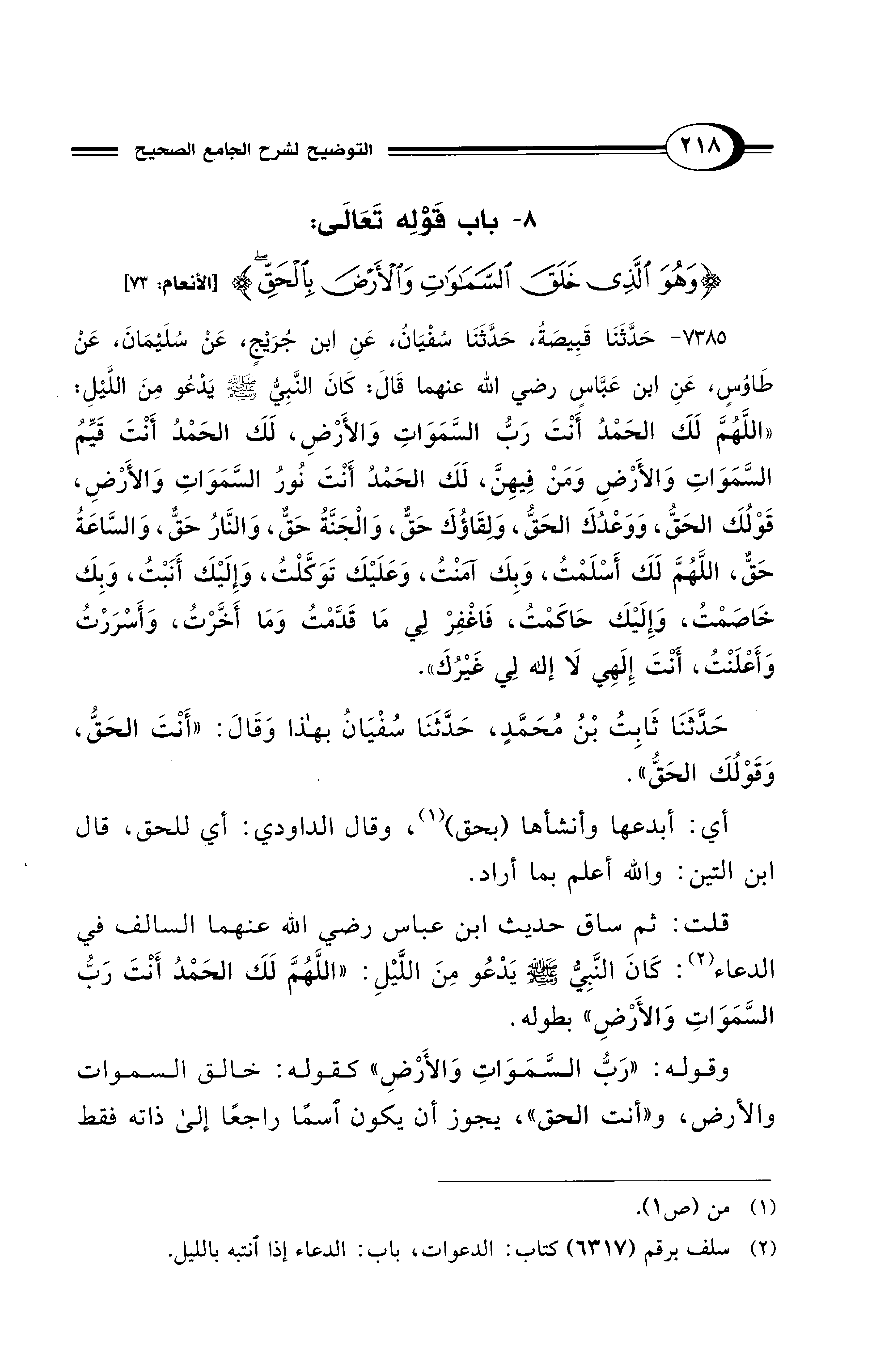 7385 - حَدَّثَنَا قَبِيصَةُ، حَدَّثَنَا سُفْيَانُ، عَنِ ابْنِ جُرَيْجٍ، عَنْ سُلَيْمَانَ، عَنْ طَاوُسٍ، عَنِ ابْنِ عَبَّاسٍ - رضي الله عنهما - قَالَ: كَانَ النَّبِيُّ - صلى الله عليه وسلم - يَدْعُو مِنَ اللَّيْلِ: «اللَّهُمَّ لَكَ الْحَمْدُ أَنْتَ رَبُّ السَّمَوَاتِ وَالأَرْضِ، لَكَ الْحَمْدُ أَنْتَ قَيِّمُ السَّمَوَاتِ وَالأَرْضِ وَمَنْ فِيهِنَّ، لَكَ الْحَمْدُ أَنْتَ نُورُ السَّمَوَاتِ وَالأَرْضِ، قَوْلُكَ الْحَقُّ، وَوَعْدُكَ الْحَقُّ، وَلِقَاؤُكَ حَقٌّ، وَالْجَنَّةُ حَقٌّ، وَالنَّارُ حَقٌّ، وَالسَّاعَةُ حَقٌّ، اللَّهُمَّ لَكَ أَسْلَمْتُ، وَبِكَ آمَنْتُ، وَعَلَيْكَ تَوَكَّلْتُ، وَإِلَيْكَ أَنَبْتُ، وَبِكَ خَاصَمْتُ، وَإِلَيْكَ حَاكَمْتُ، فَاغْفِرْ لِي مَا قَدَّمْتُ وَمَا أَخَّرْتُ، وَأَسْرَرْتُ وَأَعْلَنْتُ، أَنْتَ إِلَهِي لاَ إِلَهَ لِي غَيْرُكَ».