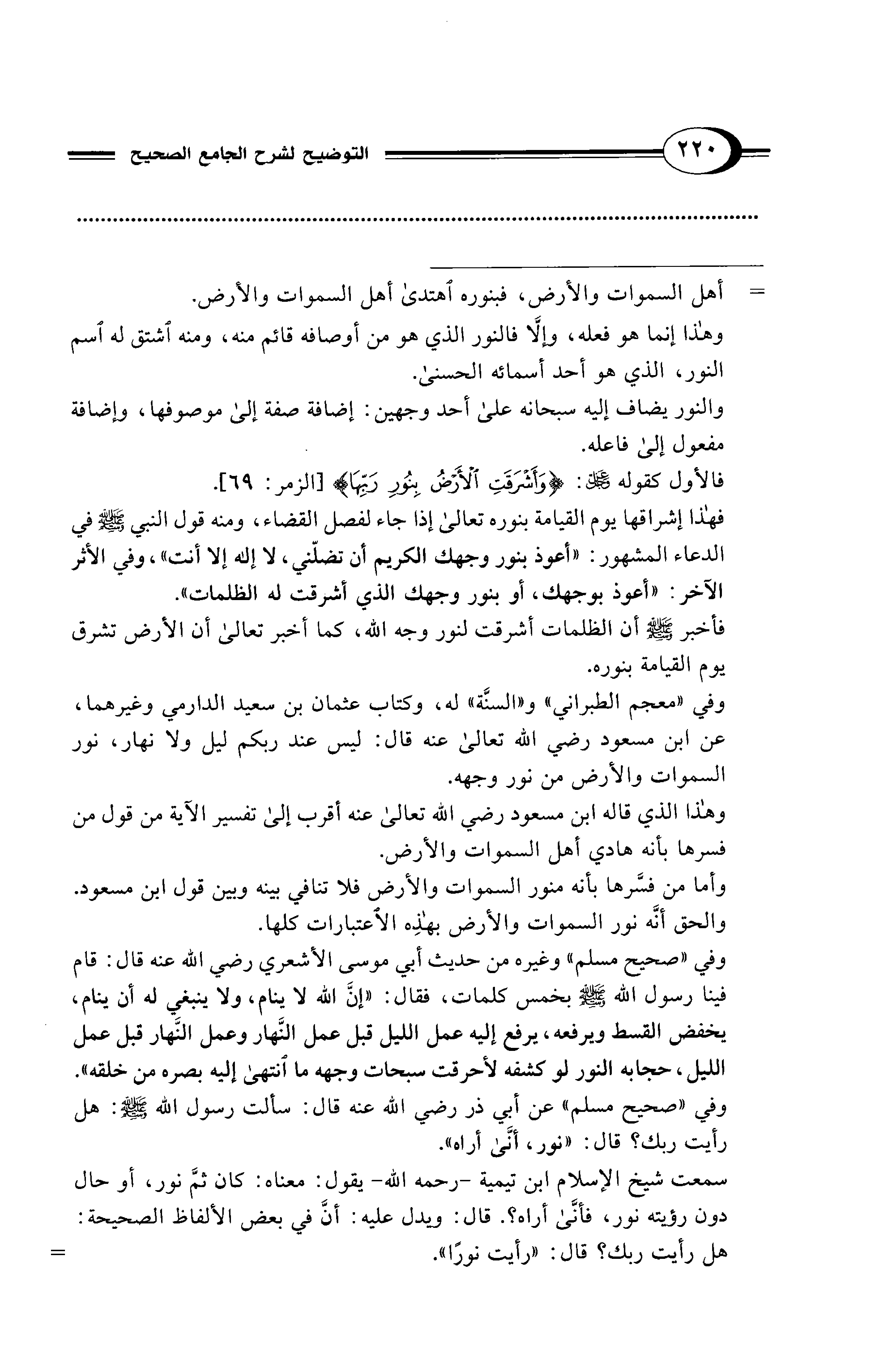 وفي "صحيح مسلم" وغيره من حديث أبي موسى الأشعري - رضي الله عنه - قال: قام فينا رسول الله - صلى الله عليه وسلم - بخمس كلمات، فقال: "إنَّ الله لا ينام، ولا ينبغي له أن ينام، يخفض القسط ويرفعه، يرفع إليه عمل الليل قبل عمل النَّهار وعمل النَّهار قبل عمل الليل، حجابه النور لو كشفه لأحرقت سبحات وجهه ما انتهى إليه بصره من خلقه". وفي " صحيح مسلم"عن أبي ذر- رضي الله عنه - قال: سألت رسول الله - صلى الله عليه وسلم -: هل رأيت ربك؟ قال: "نور، أنَّى أراه".