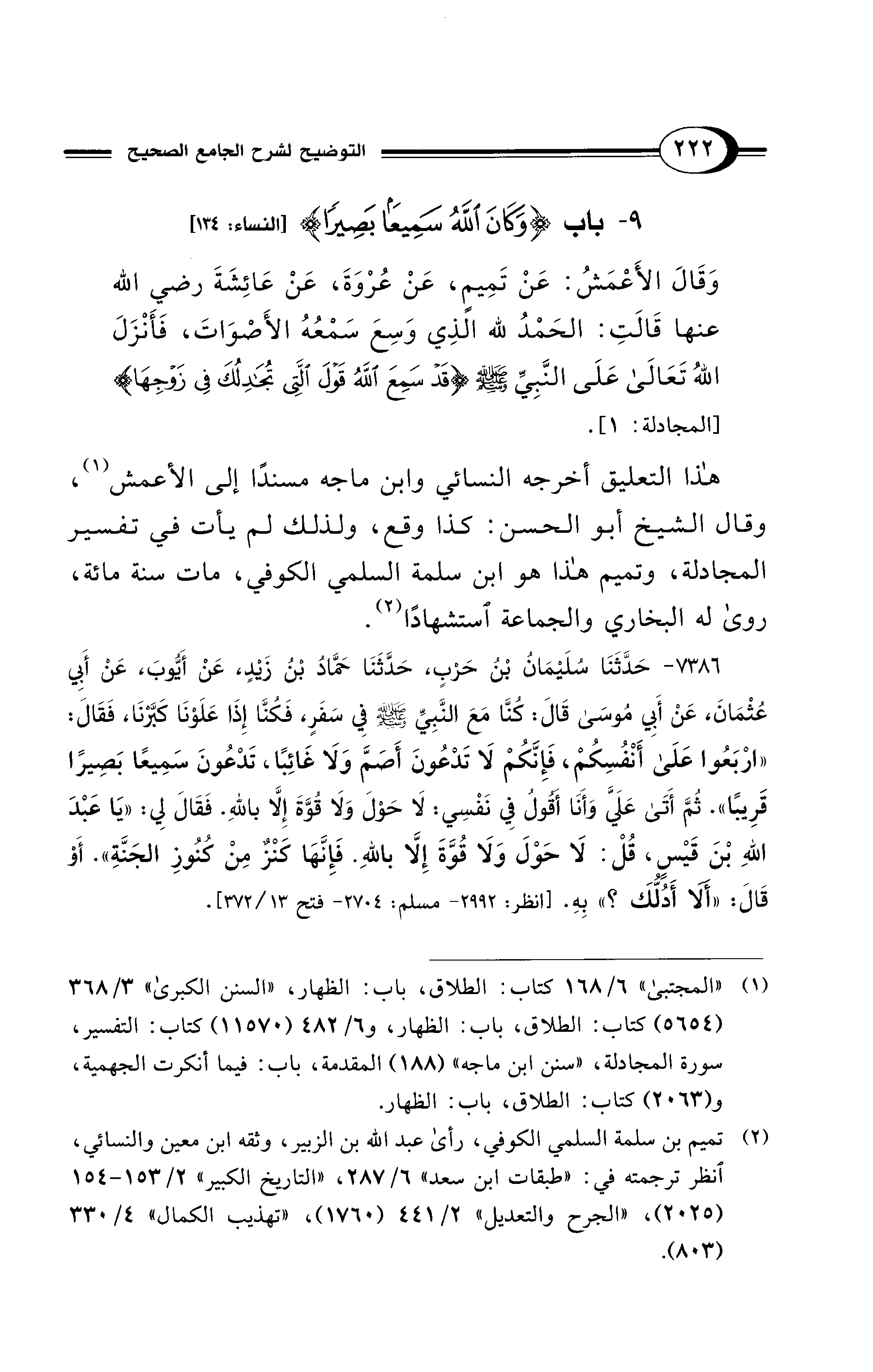 هذا التعليق أخرجه النسائي وابن ماجه مسندًا إلى الأعمش (¬1)، وقال الشيخ أبو الحسن: كذا وقع، ولذلك لم يأت في تفسير المجادلة، وتميم هذا هو ابن سلمة السلمي الكوفي، مات سنة مائة، روى له البخاري والجماعة استشهادًا (¬2).