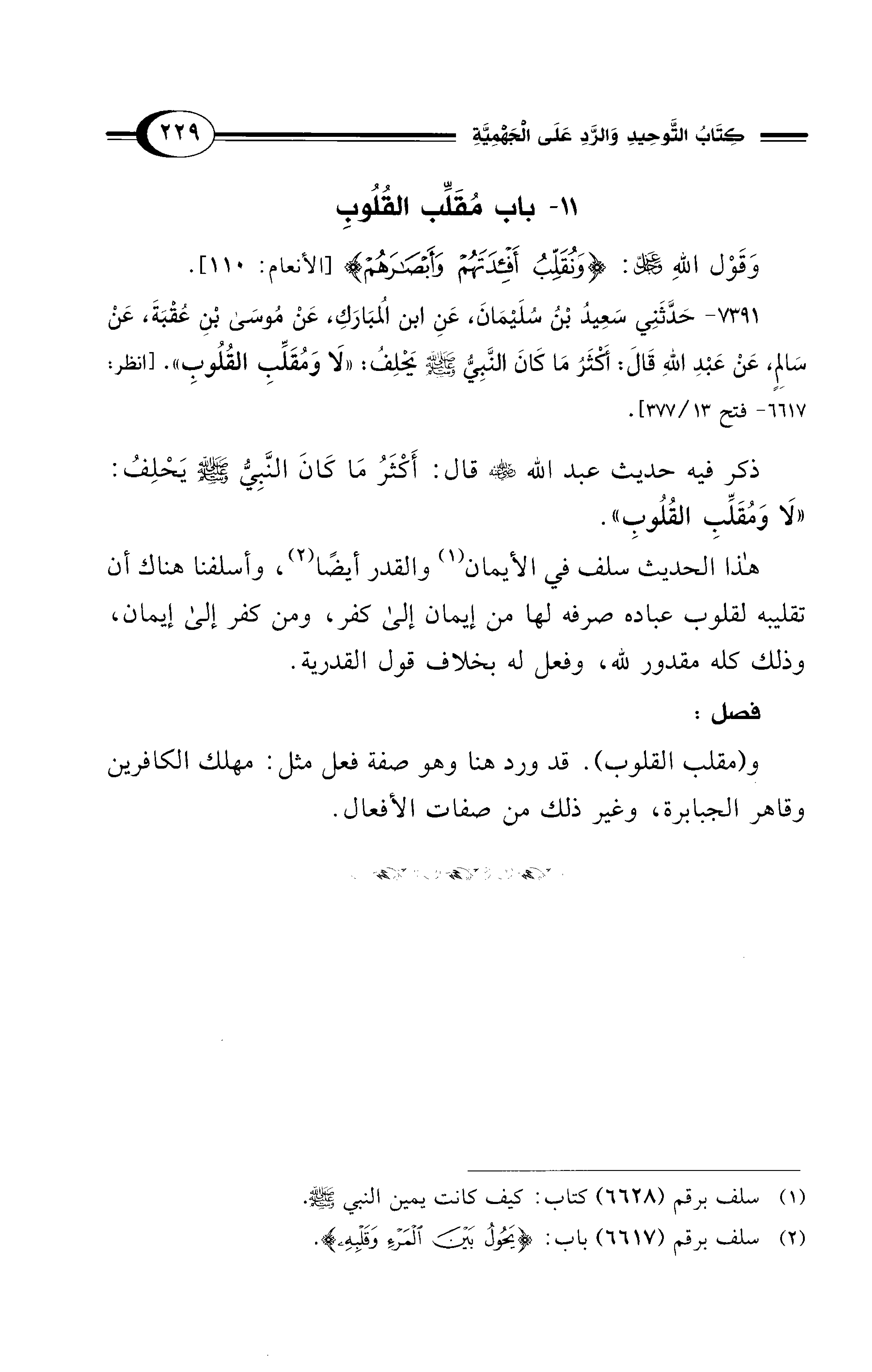 7391 - حَدَّثَنِي سَعِيدُ بْنُ سُلَيْمَانَ، عَنِ ابْنِ الْمُبَارَكِ، عَنْ مُوسَى بْنِ عُقْبَةَ، عَنْ سَالِمٍ، عَنْ عَبْدِ اللهِ قَالَ: أَكْثَرُ مَا كَانَ النَّبِيُّ - صلى الله عليه وسلم - يَحْلِفُ: «لاَ وَمُقَلِّبِ الْقُلُوبِ». [انظر: 6617 - فتح 13/ 377]
