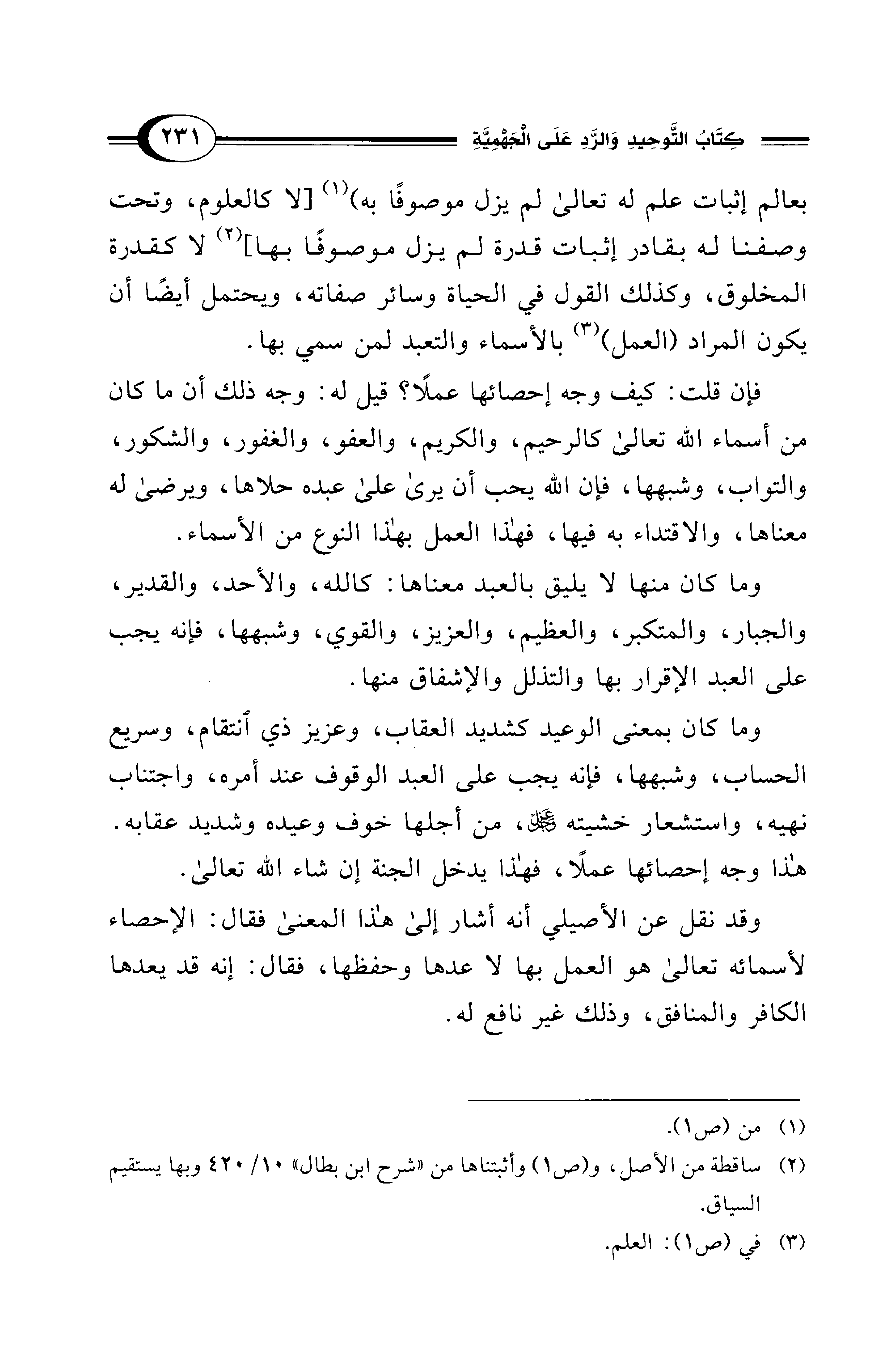 فإن قلت: كيف وجه إحصائها عملًا؟ قيل له: وجه ذلك أن ما كان من أسماء الله تعالى كالرحيم، والكريم، والعفو، والغفور، والشكور، والتواب، وشبهها، فإن الله يحب أن يرى على عبده حلاها، ويرضى له معناها، والاقتداء به فيها، فهذا العمل بهذا النوع من الأسماء.
