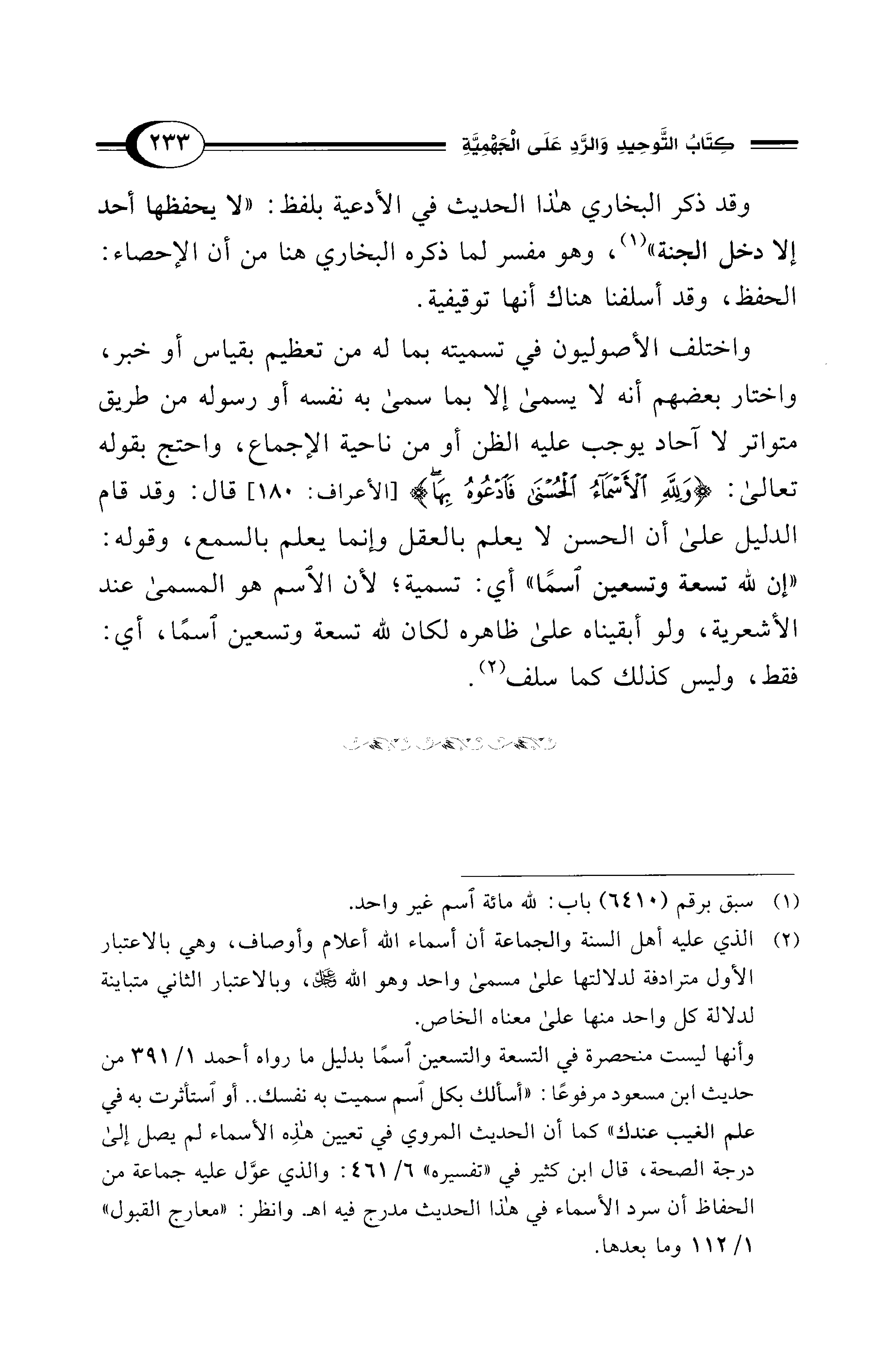 وأنها ليست منحصرة في التسعة والتسعين اسمًا بدليل ما رواه أحمد 1/ 391 من حديث ابن مسعود مرفوعًا: "أسألك بكل اسم سميت به نفسك .. أو استأثرت به في علم الغيب عندك" كما أن الحديث المروي في تعيين هذِه الأسماء لم يصل إلى درجة الصحة، قال ابن كثير في "تفسيره" 6/ 461: والذي عوَّل عليه جماعة من الحفاظ أن سرد الأسماء في هذا الحديث مدرج فيه اهـ وانظر: "معارج القبول" 1/ 112 وما بعدها.