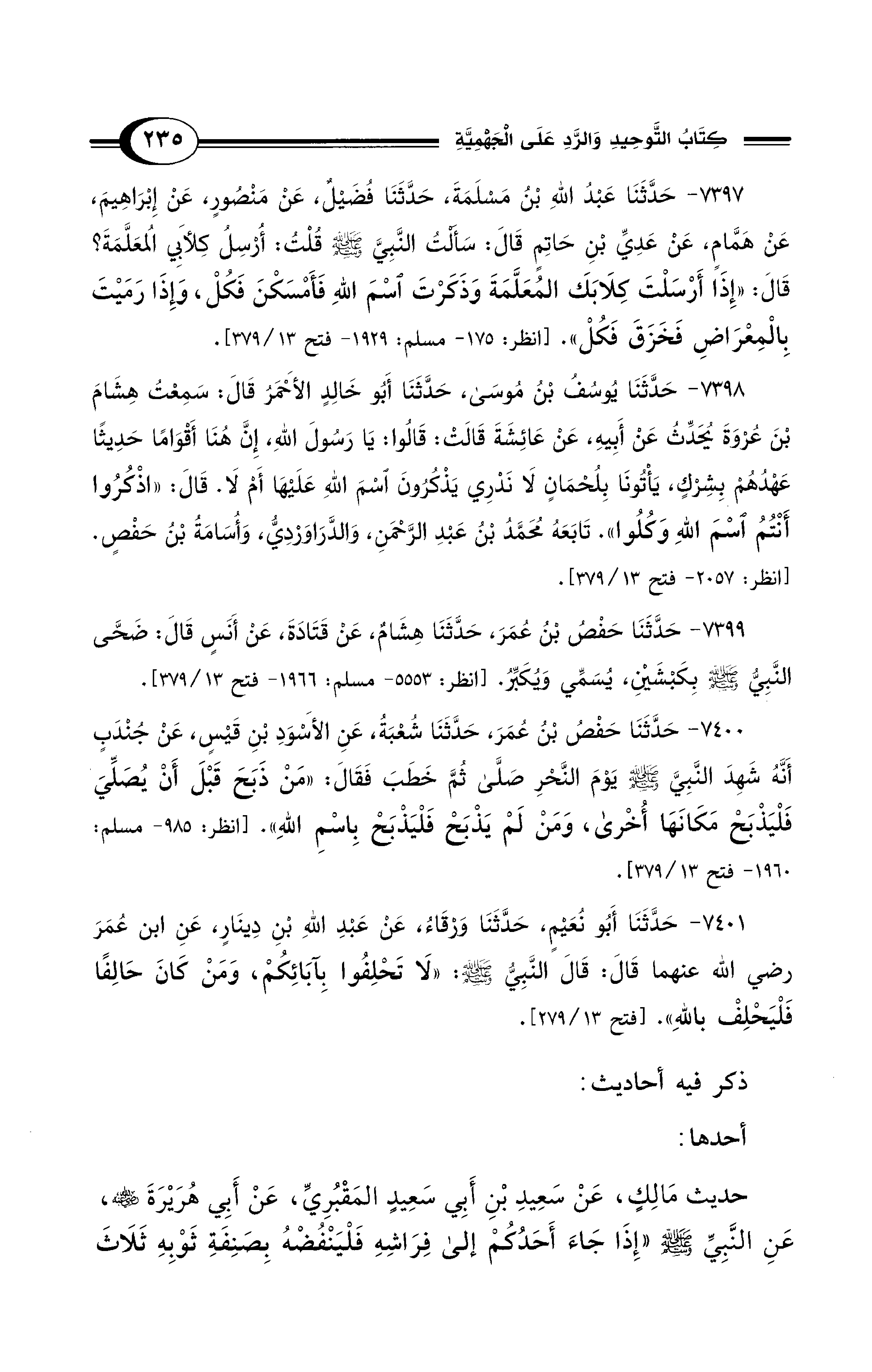 7399 - حَدَّثَنَا حَفْصُ بْنُ عُمَرَ، حَدَّثَنَا هِشَامٌ، عَنْ قَتَادَةَ، عَنْ أَنَسٍ قَالَ: ضَحَّى النَّبِيُّ - صلى الله عليه وسلم - بِكَبْشَيْنِ، يُسَمِّي وَيُكَبِّرُ. [انظر: 5553 - مسلم: 1966 - فتح 13/ 379]
