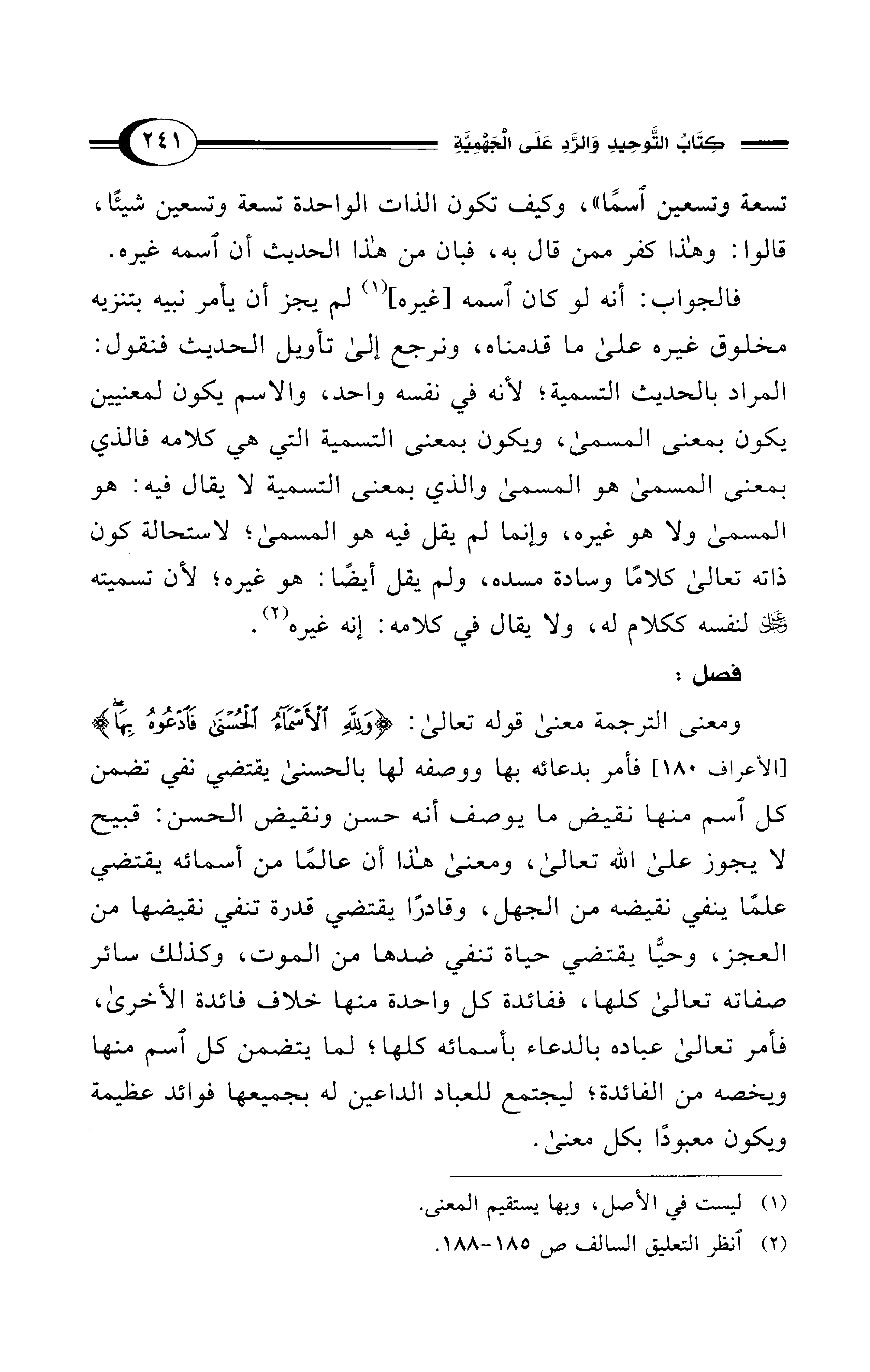 ومعنى الترجمة معنى قوله تعالى: {وَلِلَّهِ الْأَسْمَاءُ الْحُسْنَى فَادْعُوهُ بِهَا} [الأعراف: 180] فأمر بدعائه بها ووصفه لها بالحسنى يقتضي نفي تضمن كل اسم منها نقيض ما يوصف أنه حسن ونقيض الحسن: قبيح لا يجوز على الله تعالى، ومعنى هذا أن عالمًا من أسمائه يقتضي علمًا ينفي نقيضه من الجهل، وقادرًا يقتضي قدرة تنفي نقيضها من العجز، وحيًّا يقتضي حياة تنفي ضدها من الموت، وكذلك سائر صفاته تعالى كلها، ففائدة كل واحدة منها خلاف فائدة الأخرى، فأمر تعالى عباده بالدعاء بأسمائه كلها؛ لما يتضمن كل اسم منها ويخصه من الفائدة؛ ليجتمع للعباد الداعين له بجميعها فوائد عظيمة ويكون معبودًا بكل معنى.