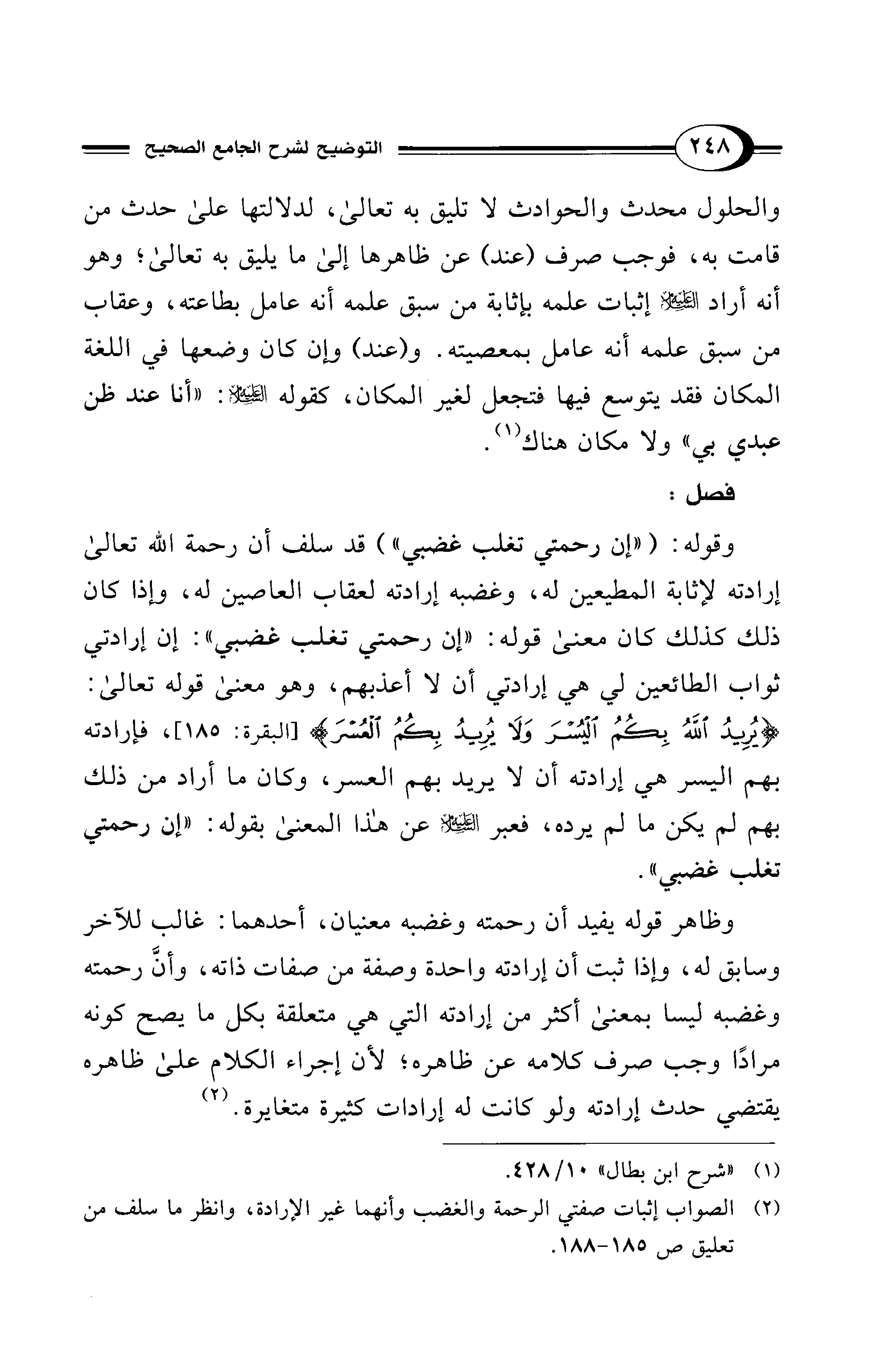 وظاهر قوله يفيد أن رحمته وغضبه معنيان، أحدهما: غالب للآخر وسابق له، وإذا ثبت أن إرادته واحدة وصفة من صفات ذاته، وأنَّ رحمته وغضبه ليسا بمعنى أكثر من إرادته التي هي متعلقة بكل ما يصح كونه مرادًا وجب صرف كلامه عن ظاهره؛ لأن إجراء الكلام على ظاهره يقتضي حدث إرادته ولو كانت له إرادات كثيرة متغايرة. (¬2)