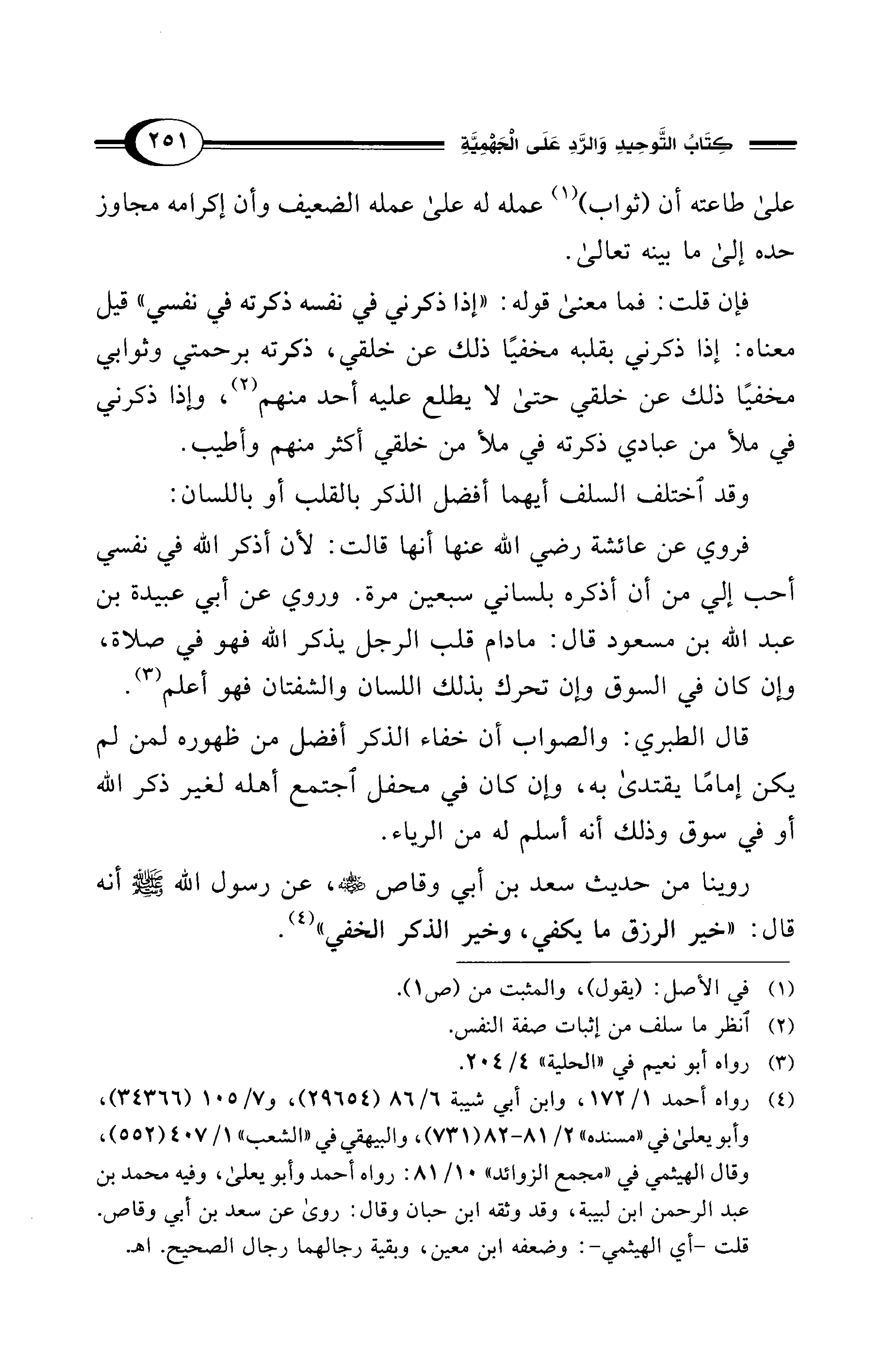 (¬4) رواه أحمد 1/ 172، وابن أبي شيبة 6/ 86 (29654)، و7/ 105 (34366)، وأبو يعلى في "مسنده" 2/ 81 - 82 (731)، والبيهقي في "الشعب" 1/ 407 (552)، وقال الهيثمي في "مجمع الزوائد"10/ 81: رواه أحمد وأبو يعلى، وفيه محمد بن عبد الرحمن ابن لبيبة، وقد وثقه ابن حبان وقال: روي عن سعد بن أبي وقاص. قلت -أي الهيثمي-: وضعفه ابن معين، وبقية رجالهما رجال الصحيح. اهـ