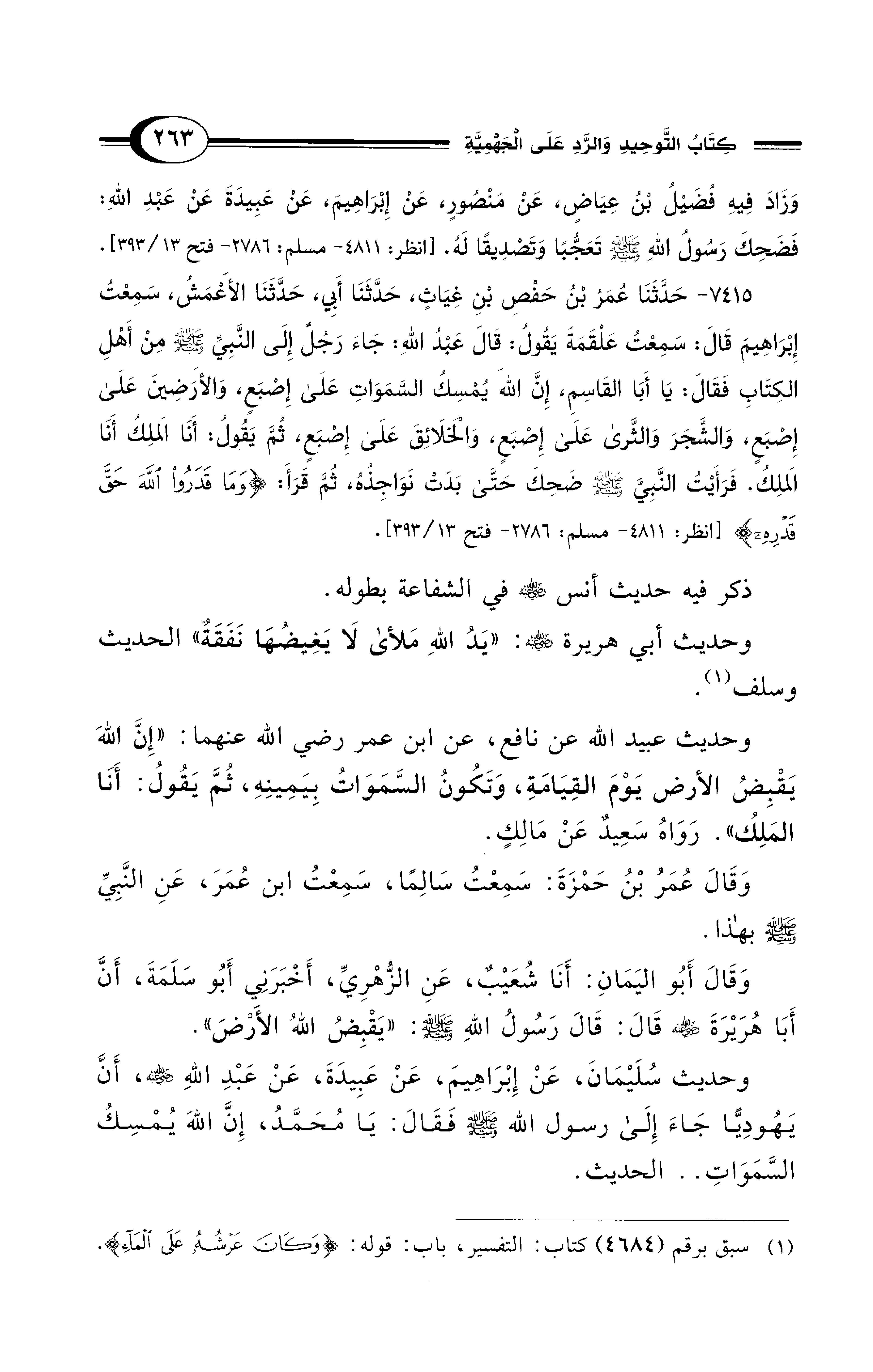 7415 - حَدَّثَنَا عُمَرُ بْنُ حَفْصِ بْنِ غِيَاثٍ، حَدَّثَنَا أَبِي، حَدَّثَنَا الأَعْمَشُ، سمِعْتُ إِبْرَاهِيمَ قَالَ: سَمِعْتُ عَلْقَمَةَ يَقُولُ: قَالَ عَبْدُ اللهِ: جَاءَ رَجُلٌ إِلَى النَّبِيِّ - صلى الله عليه وسلم - مِنْ أَهْلِ الْكِتَابِ فَقَالَ: يَا أَبَا الْقَاسِمِ، إِنَّ اللهَ يُمْسِكُ السَّمَوَاتِ عَلَى إِصْبَعٍ، وَالأَرَضِينَ عَلَى إِصْبَعٍ، وَالشَّجَرَ وَالثَّرَى عَلَى إِصْبَعٍ، وَالْخَلاَئِقَ عَلَى إِصْبَعٍ، ثُمَّ يَقُولُ: أَنَا الْمَلِكُ أَنَا الْمَلِكُ. فَرَأَيْتُ النَّبِيَّ - صلى الله عليه وسلم - ضَحِكَ حَتَّى بَدَتْ نَوَاجِذُهُ، ثُمَّ قَرَأ: {وَمَا قَدَرُوا اللهَ حَقَّ قَدْرِهِ}. [انظر: 4811 - مسلم: 2786 - فتح 13/ 393]
