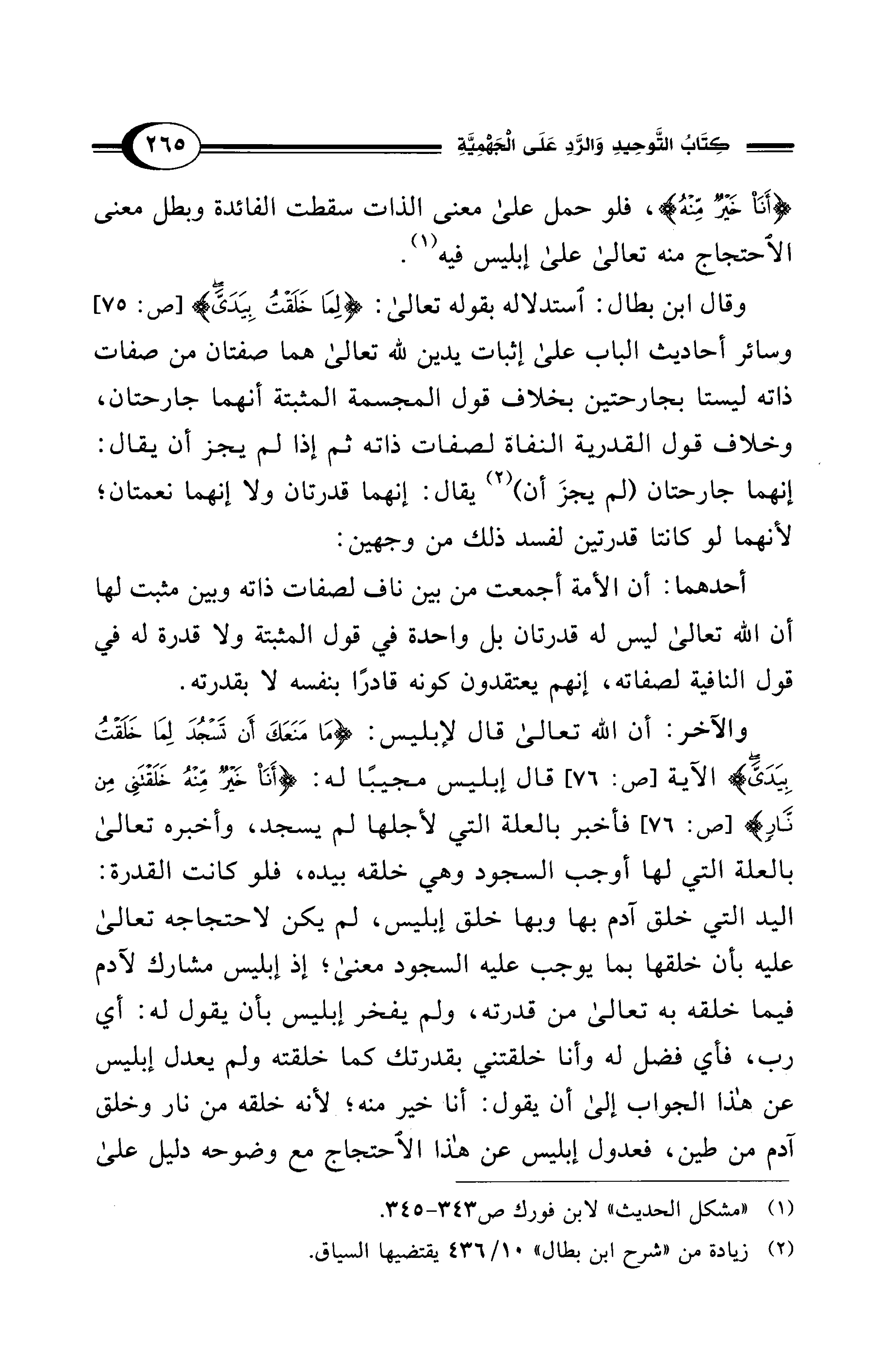 والآخر: أن الله تعالى قال لإبليس: {مَا مَنَعَكَ أَنْ تَسْجُدَ لِمَا خَلَقْتُ بِيَدَيَّ} الآية [ص: 76] قال إبليس مجيبًا له: {أَنَا خَيْرٌ مِنْهُ خَلَقْتَنِي مِنْ نَارٍ} [ص: 76] فأخبر بالعلة التي لأجلها لم يسجد، وأخبره تعالى بالعلة التي لها أوجب السجود وهي خلقه بيده، فلو كانت القدرة: اليد التي خلق آدم بها وبها خلق إبليس، لم يكن لاحتجاجه تعالى عليه بأن خلقها بما يوجب عليه السجود معنى؛ إذ إبليس مشارك لآدم فيما خلقه به تعالى من قدرته، ولم يفخر إبليس بأن يقول له: أي رب، فأي فضل له وأنا خلقتني بقدرتك كما خلقته ولم يعدل إبليس عن هذا الجواب إلى أن يقول: أنا خير منه؛ لأنه خلقه من نار وخلق آدم من طين، فعدول إبليس عن هذا الاحتجاج مع وضوحه دليل على