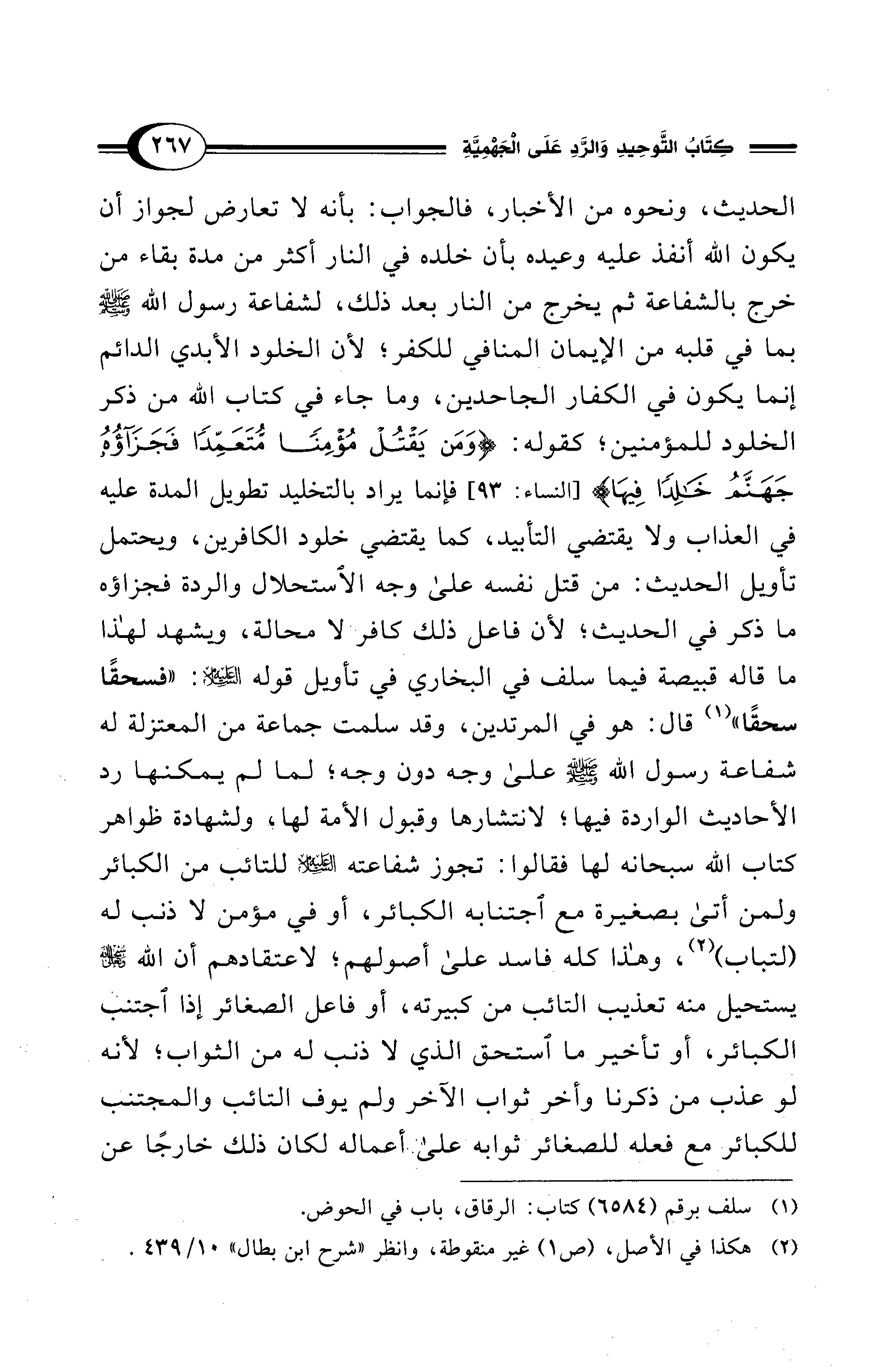 الحديث، ونحوه من الأخبار، فالجواب: بأنه لا تعارض لجواز أن يكون الله أنفذ عليه وعيده بأن خلده في النار أكثر من مدة بقاء من خرج بالشفاعة ثم يخرج من النار بعد ذلك، لشفاعة رسول الله - صلى الله عليه وسلم - بما في قلبه من الإيمان المنافي للكفر؛ لأن الخلود الأبدي الدائم إنما يكون في الكفار الجاحدين، وما جاء في كتاب الله من ذكر الخلود للمؤمنين؛ كقوله: {وَمَنْ يَقْتُلْ مُؤْمِنًا مُتَعَمِّدًا فَجَزَاؤُهُ جَهَنَّمُ خَالِدً فِيهَا} [النساء: 93] فإنما يراد بالتخليد تطويل المدة عليه في العذاب ولا يقتضي التأبيد، كما يقتضي خلود الكافرين، ويحتمل تأويل الحديث: من قتل نفسه على وجه الاستحلال والردة فجزاؤه ما ذكر في الحديث؛ لأن فاعل ذلك كافر لا محالة، ويشهد لهذا ما قاله قبيصة فيما سلف في البخاري في تأويل قوله - عليه السلام -: " فسحقًا سحقًا" (¬1) قال: هو في المرتدين، وقد سلمت جماعة من المعتزلة له شفاعة رسول الله - صلى الله عليه وسلم - على وجه دون وجه؛ لما لم يمكنها رد الأحاديث الواردة فيها؛ لانتشارها وقبول الأمة لها، ولشهادة ظواهر كتاب الله سبحانه لها فقالوا: تجوز شفاعته - عليه السلام - للتائب من الكبائر ولمن أتى بصغيرة مع اجتنابه الكبائر، أو في مؤمن لا ذنب له (لتباب) (¬2)، وهذا كله فاسد على أصولهم؛ لاعتقادهم أن الله -سبحانه وتعالى- يستحيل منه تعذيب التائب من كبيرته، أو فاعل الصغائر إذا اجتنب الكبائر، أو تأخير ما استحق الذي لا ذنب له من الثواب؛ لأنه لو عذب من ذكرنا وأخر ثواب الآخر ولم يوف التائب والمجتنب للكبائر مع فعله للصغائر ثوابه على أعماله لكان ذلك خارجًا عن